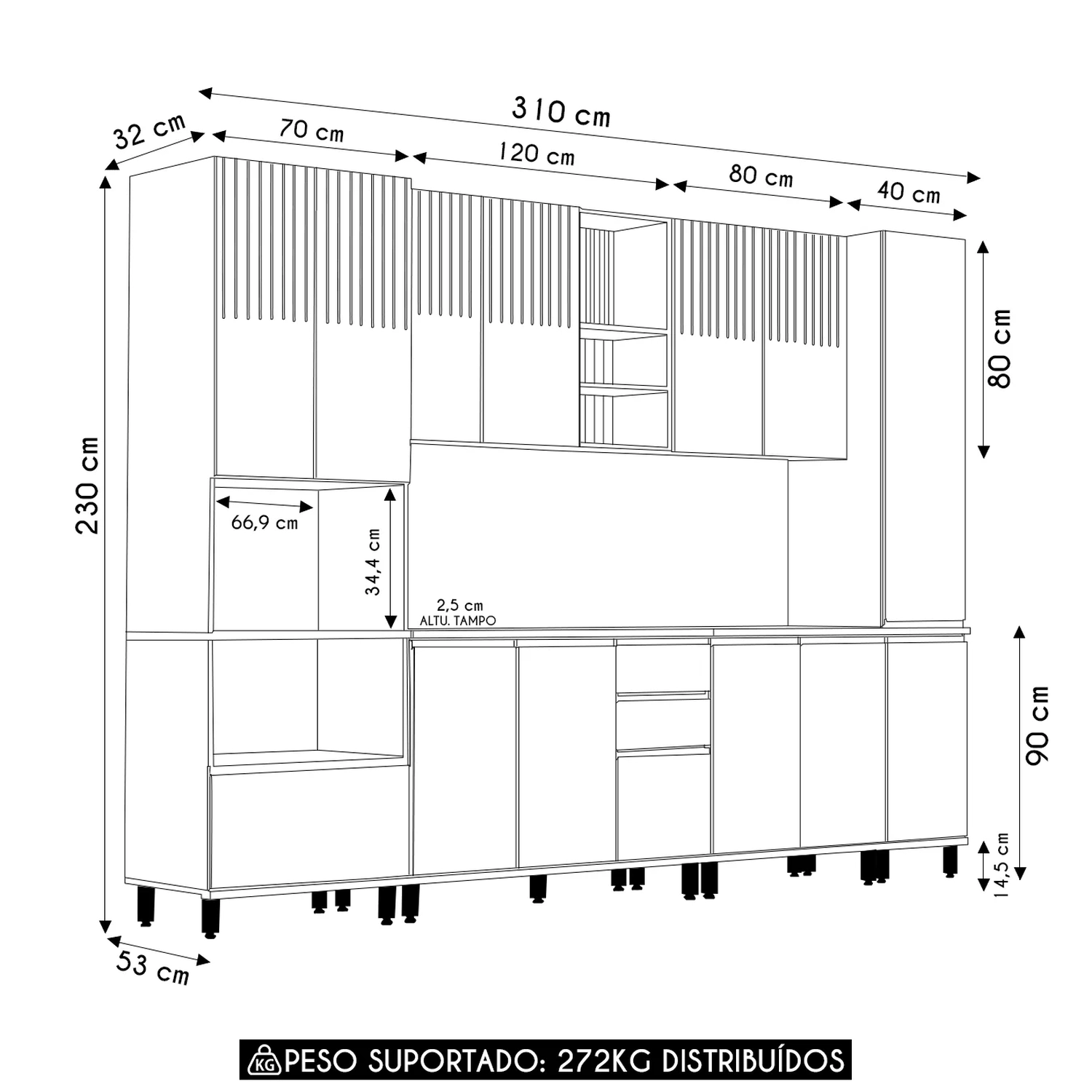 Peso Suportado Distribuído: Paneleiros 112kg/ Aéreos 71kg/ Balcões 74kg/ Tampo 15kg.