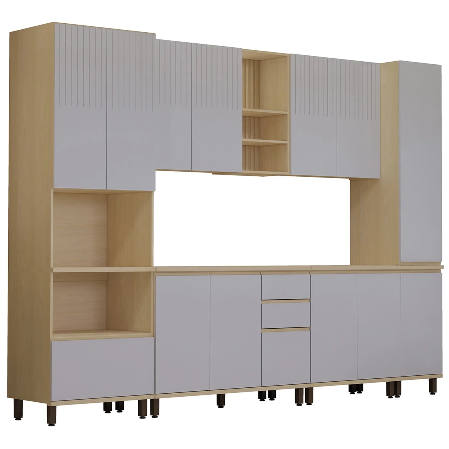O Armário Aéreo de 120cm oferece duas portas, duas prateleiras internas e nichos com fundo ripado, agregando sofisticação ao ambiente. O Armário de Cozinha aéreo de 80cm tem duas portas e uma prateleira.