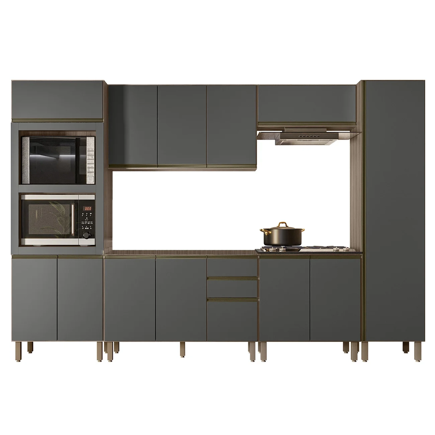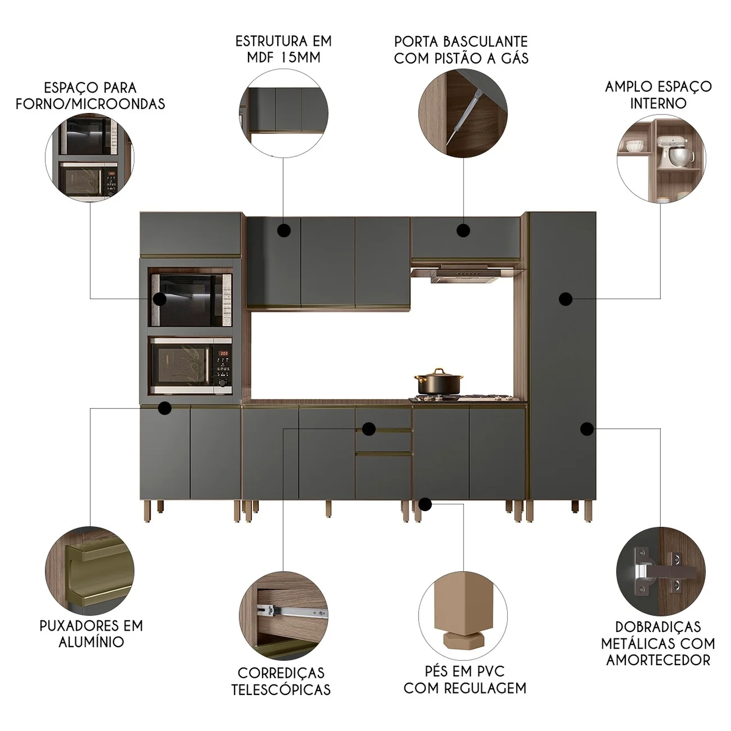 O Paneleiro Torre Quente Duplo, é um móvel funcional e moderno, projetado para oferecer praticidade e organização ao ambiente. Com duas portas inferiores e uma prateleira interna, oferece espaço adicional para armazenar e organizar. A porta superior basculante com pistão a gás facilita o acesso e integra eletrodomésticos como forno e micro-ondas ao móvel. O Armário de Cozinha Aéreo 120cm oferece três portas e uma prateleira interna para organizar itens de diferentes tamanhos. O Balcão Para Pia 120cm sem tampo possui duas portas e três gavetas espaçosas, incluindo um gavetão, com pés em PVC reguláveis que asseguram estabilidade mesmo em pisos irregulares. O Armário Aéreo Basculante 80cm, com pistão a gás, proporciona um movimento suave e silencioso ao abrir e fechar a porta, aumentando a durabilidade do armário. O Balcão Para Cooktop conta com duas portas, o tampo tem recorte para cooktop 4 bocas e marcação para 5 bocas. O Paneleiro de 50cm com uma porta única que facilita o acesso às três prateleiras internas, é uma peça chave para manter a organização e agregar valor estético à cozinha. Todos os móveis possuem estrutura em MDF de 15mm, acabamento em pintura UV, dobradiças metálicas com amortecedor para um fechamento suave e silencioso, e puxadores em alumínio.