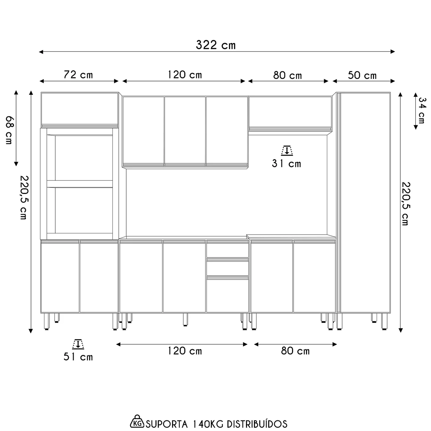 Armário Aéreo: 120 x 68 x 31 cm.