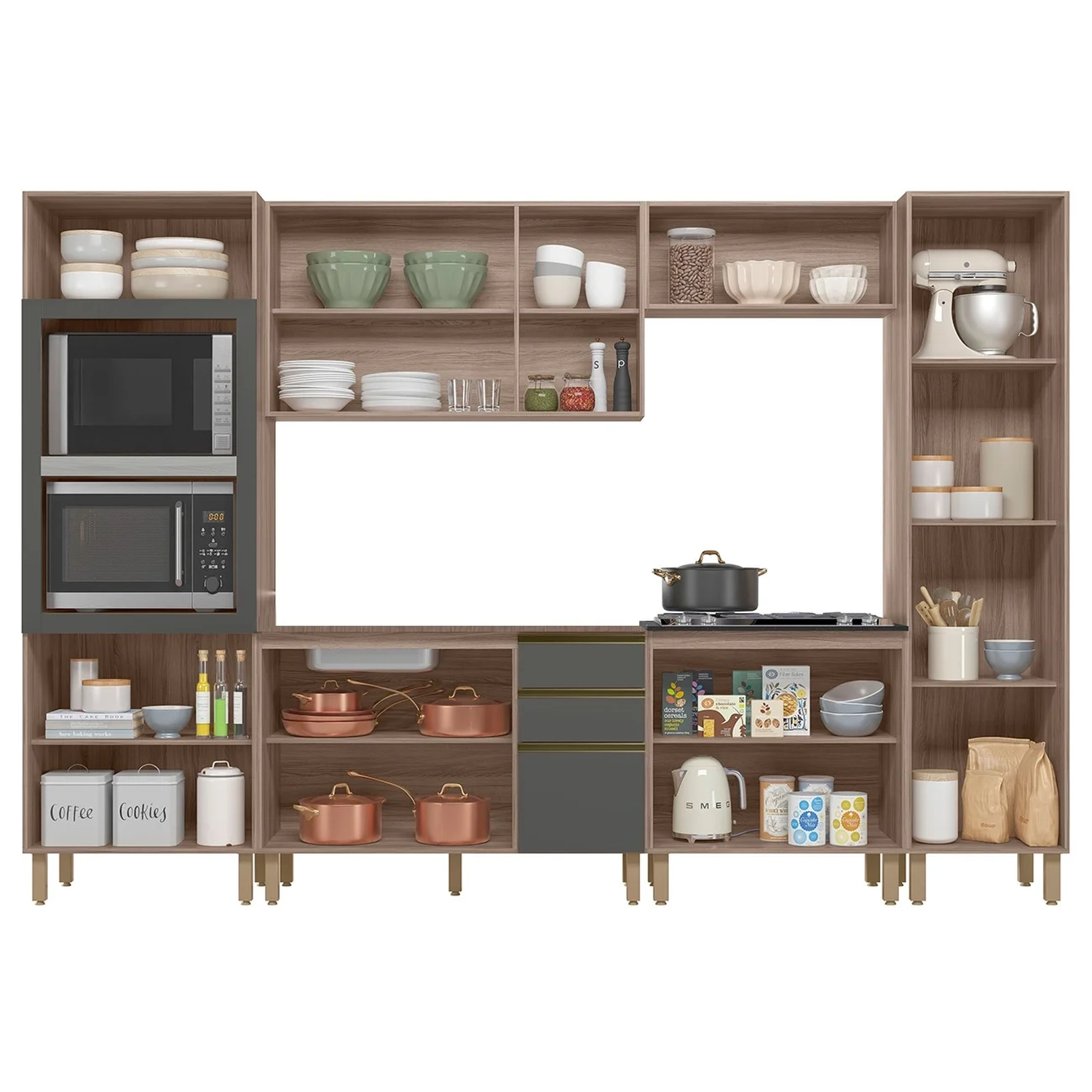Conteúdo da Embalagem: 1 Balcão 120cm, 1 Balcão 80cm, 1 Armário Aéreo 120cm, 1 Armário Basculante, 1 Paneleiro Torre, 1 Paneleiro 50cm.