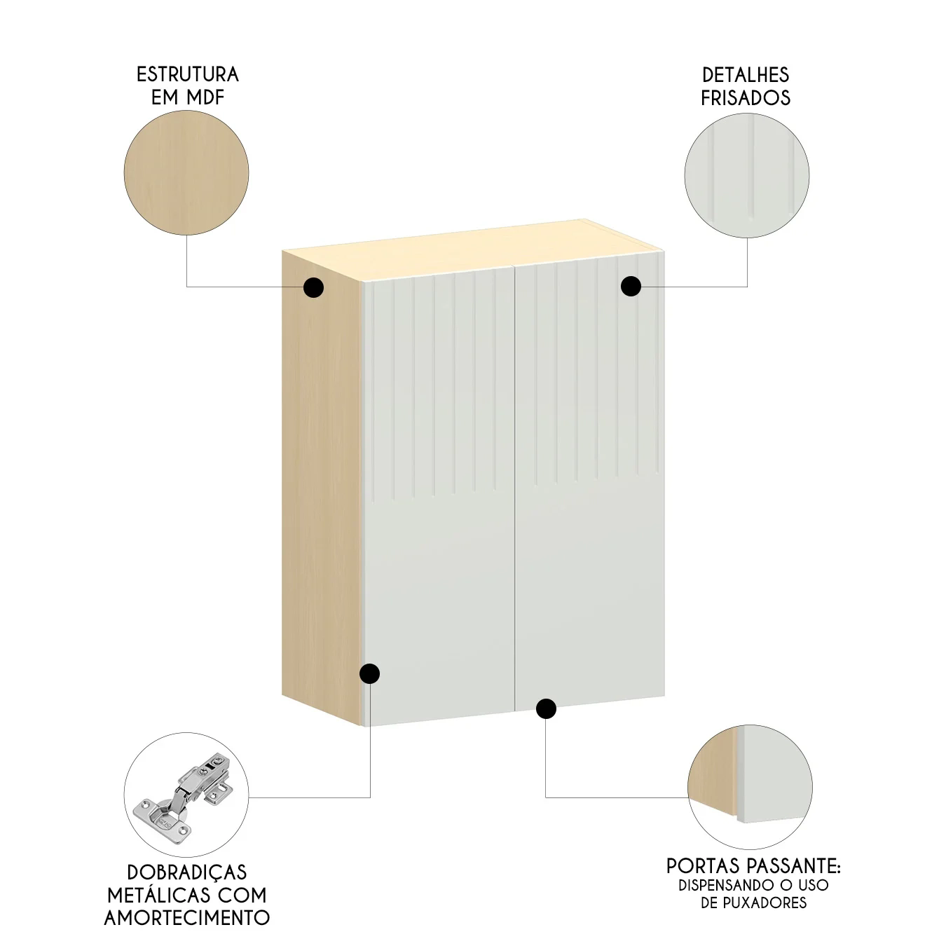 As portas passantes do armário tem detalhes frisados, e são equipadas com dobradiças metálicas, que possuem um sistema de amortecimento, proporcionando um fechamento suave e silencioso.