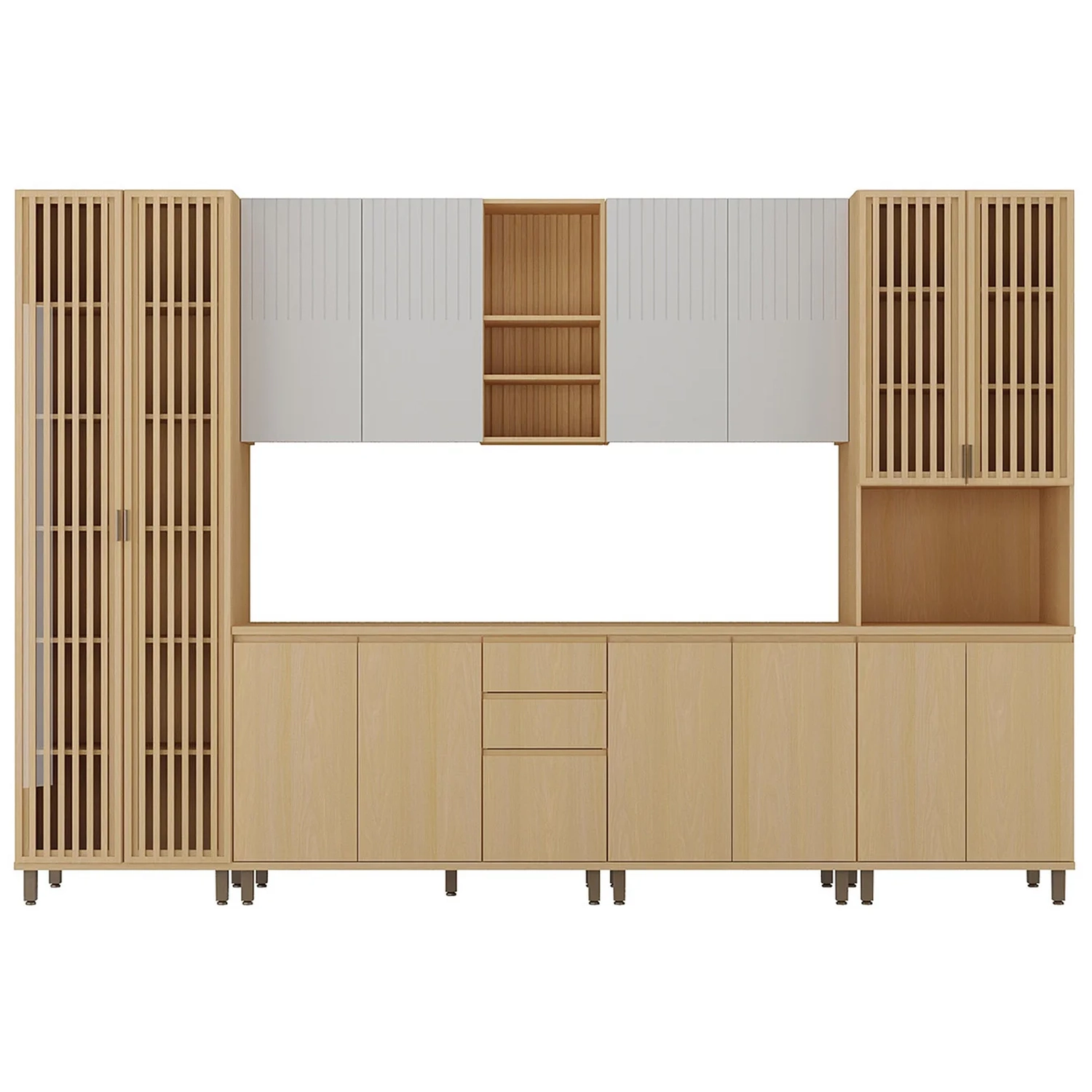 O Paneleiro de Cozinha tipo cristaleira conta com duas portas ripadas de vidro e prateleiras internas, proporcionando amplo espaço para armazenamento e um visual elegante. O Paneleiro Para Cozinha possui nicho específico para o micro-ondas, mantendo a cozinha organizada e moderna, também com portas ripadas de vidro e prateleiras.