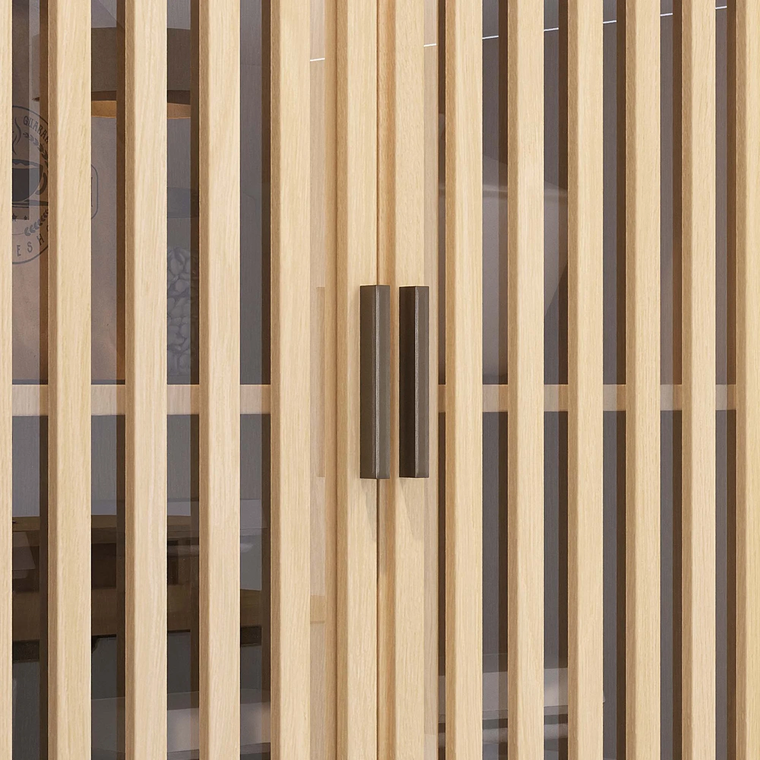 O Armário de Cozinha Aéreo de 80cm tem duas portas passantes e uma prateleira, enquanto o Armário Aéreo de 120cm oferece duas portas passantes, duas prateleiras internas e nichos com fundo ripado, agregando sofisticação ao ambiente.