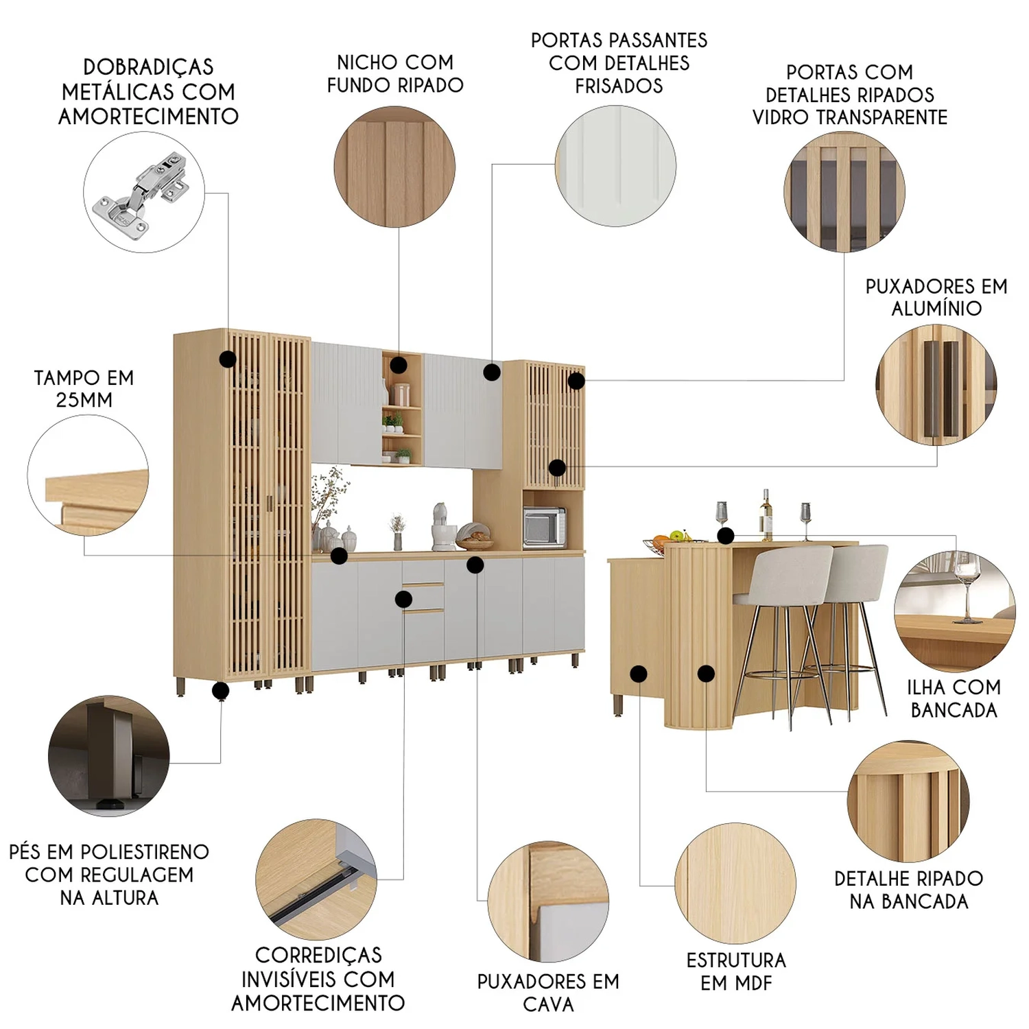 Esse armário de cozinha conta uma ilha, composta com um balcão, um tampo de 1,20cm, além de uma bancada de 1,64cm com detalhes ripados e cantos arredondados, que valoriza mais a cozinha, sendo ideal para preparo de refeições e almoços rápidos. As portas possuem dobradiças metálicas com sistema de amortecimento, e os aéreos têm frisos elegantes. As gavetas possuem corrediças invisíveis com amortecimento, que além de garantir um deslizar suave, valoriza ainda mais o móvel. Além disso, os paneleiros e balcões possuem pés reguláveis, garantindo maior estabilidade.