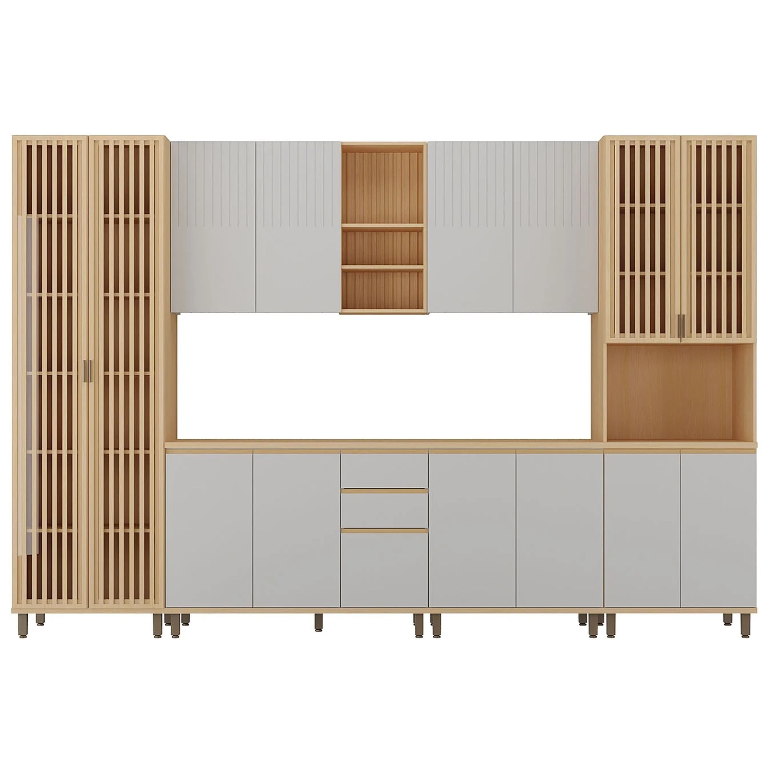 O Paneleiro de Cozinha tipo cristaleira conta com duas portas ripadas de vidro e prateleiras internas, proporcionando amplo espaço para armazenamento e um visual elegante. O Paneleiro de Cozinha Micro-ondas possui nicho específico para o micro-ondas, mantendo a cozinha organizada e moderna, também com portas ripadas de vidro e prateleiras.