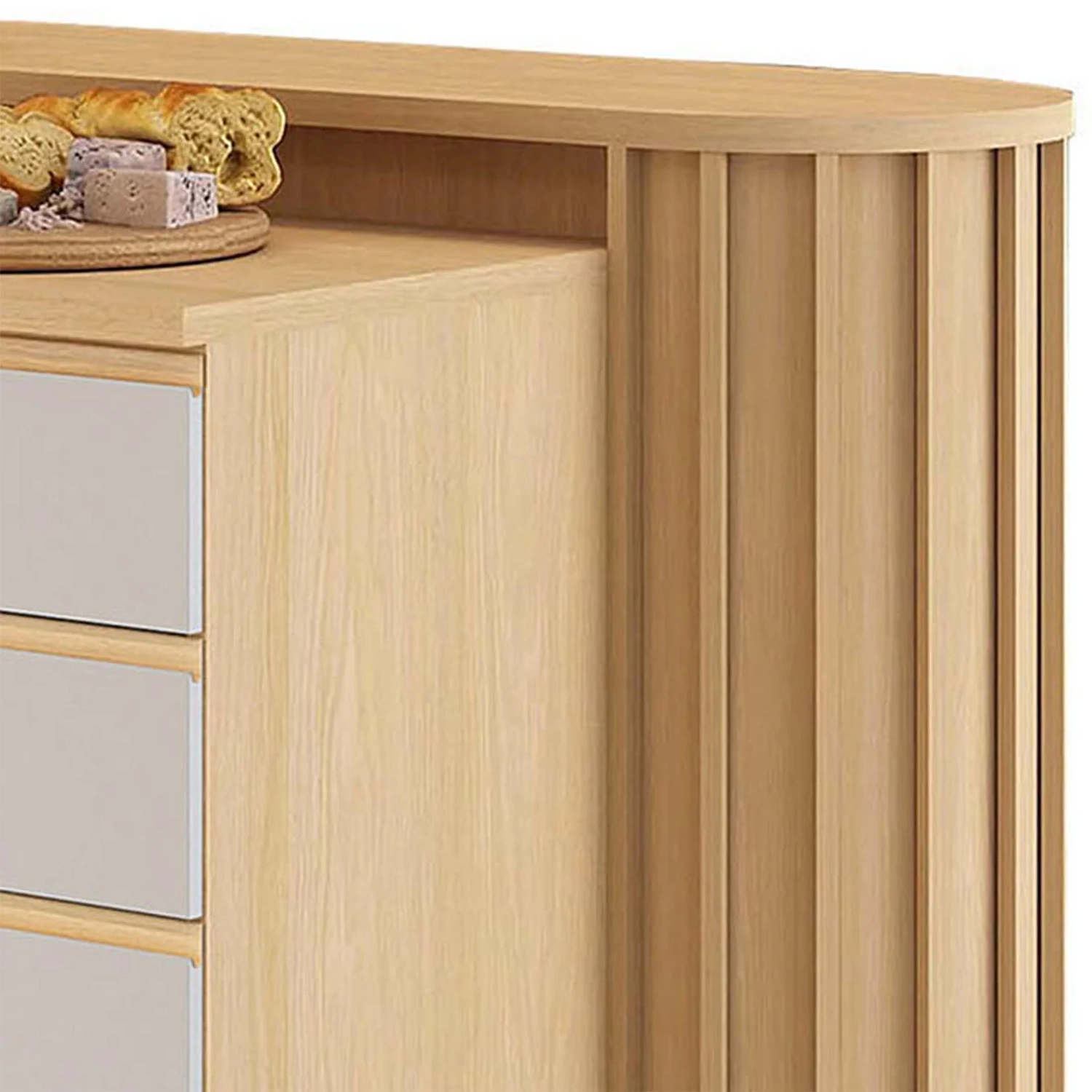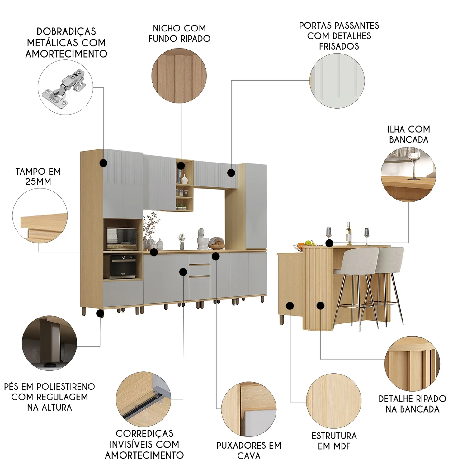 As gavetas possuem corrediças invisíveis com amortecimento, garantindo um deslizar suave e maior resistência. As portas têm dobradiças metálicas com sistema de amortecimento, proporcionando um fechamento suave e silencioso. O Armário de Cozinha conta com uma ilha, composta por um balcão e tampo de 1,20cm, além de uma bancada de 1,64cm com detalhes ripados e cantos arredondados, ideal para o preparo de refeições e almoços rápidos.