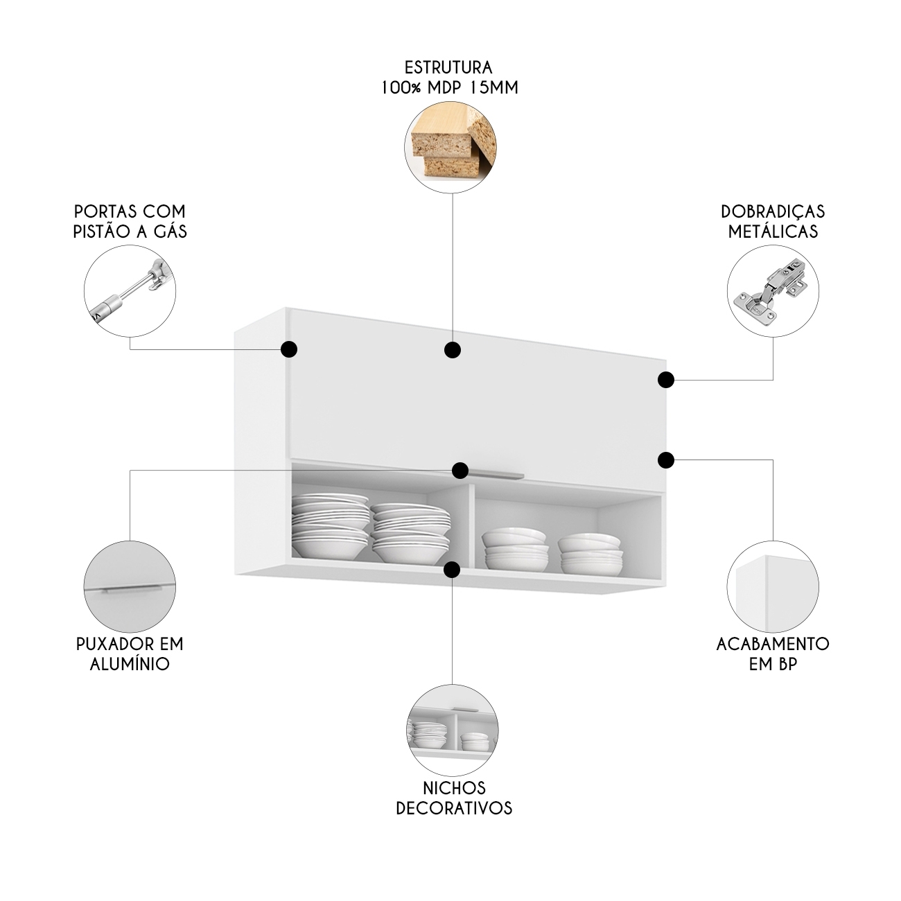 O Armário Aéreo conta com uma porta basculante com dobradiças metálicas. O pistão a gás proporciona uma abertura suave e controlada, além de maior segurança no uso diário. Os dois nichos somados ao puxador em alumínio se destacam como um elegante ponto de design, enquanto o amplo espaço interno é excelente para manter seus utensílios organizados de maneira eficiente. Fabricado em MDP 15mm, com acabamento em BP, oferece maior resistência, prolongando sua vida útil. Esse Armário de Cozinha é a escolha ideal para quem busca praticidade e estilo.
