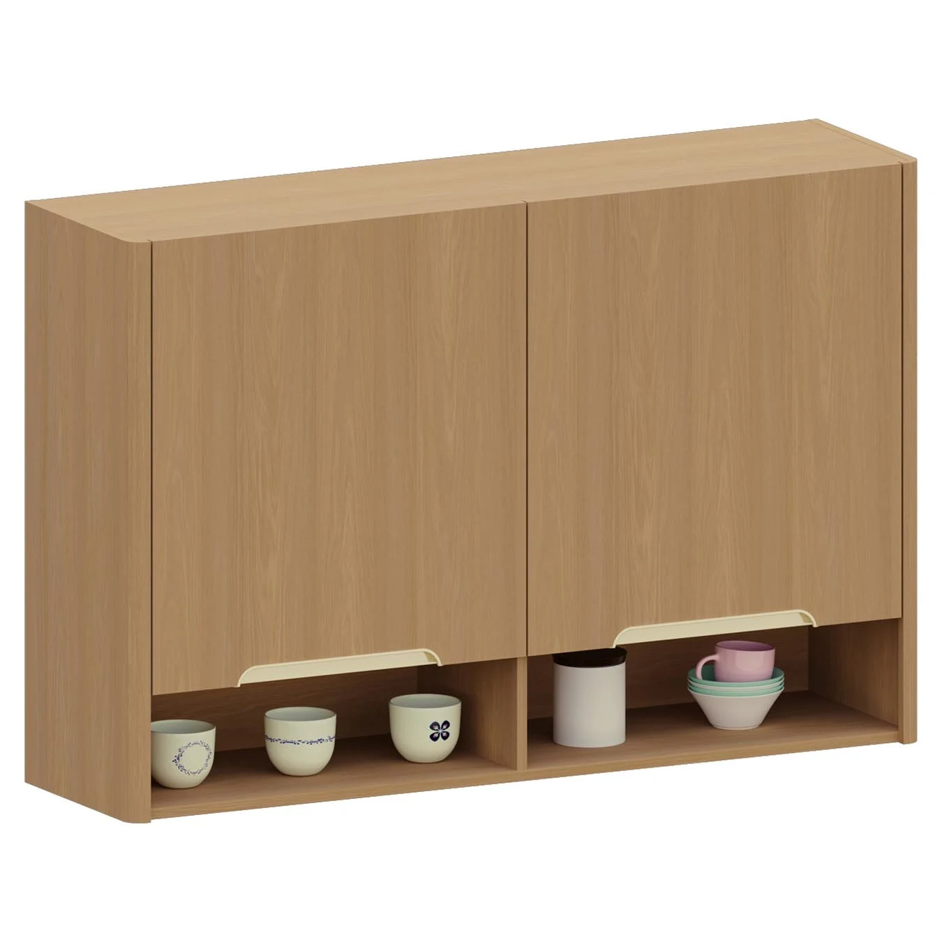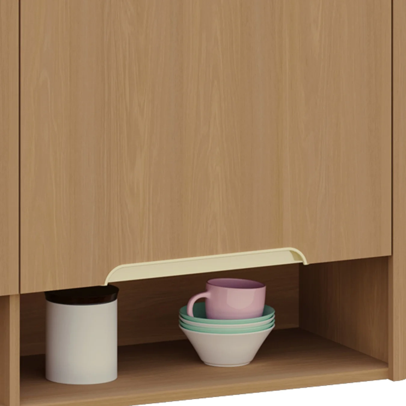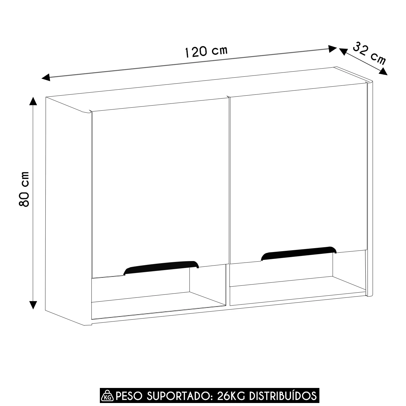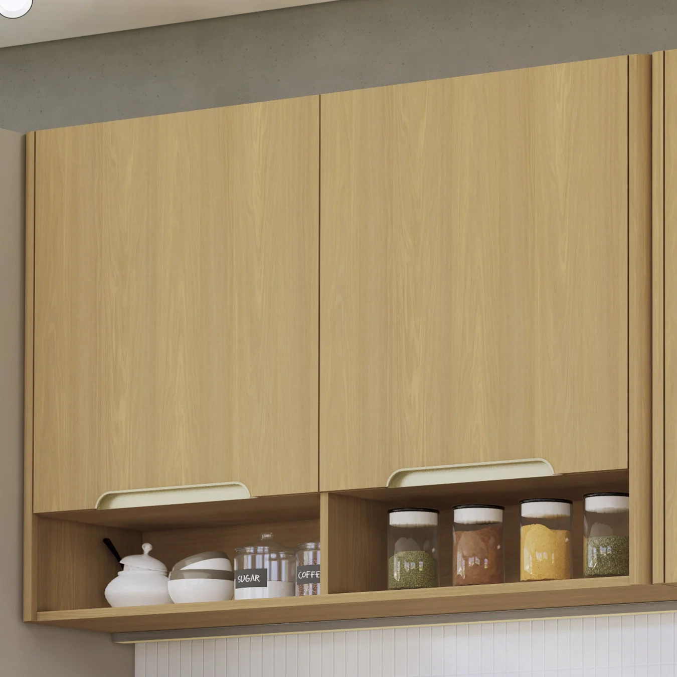 Com duas portas equipadas com dobradiças metálicas com sistema de amortecimento, o Armário Aéreo garante um fechamento suave e silencioso. Além disso, os puxadores em poliestireno que lembram a forma de meia-lua adicionam um toque contemporâneo e prático, complementando o visual da peça.