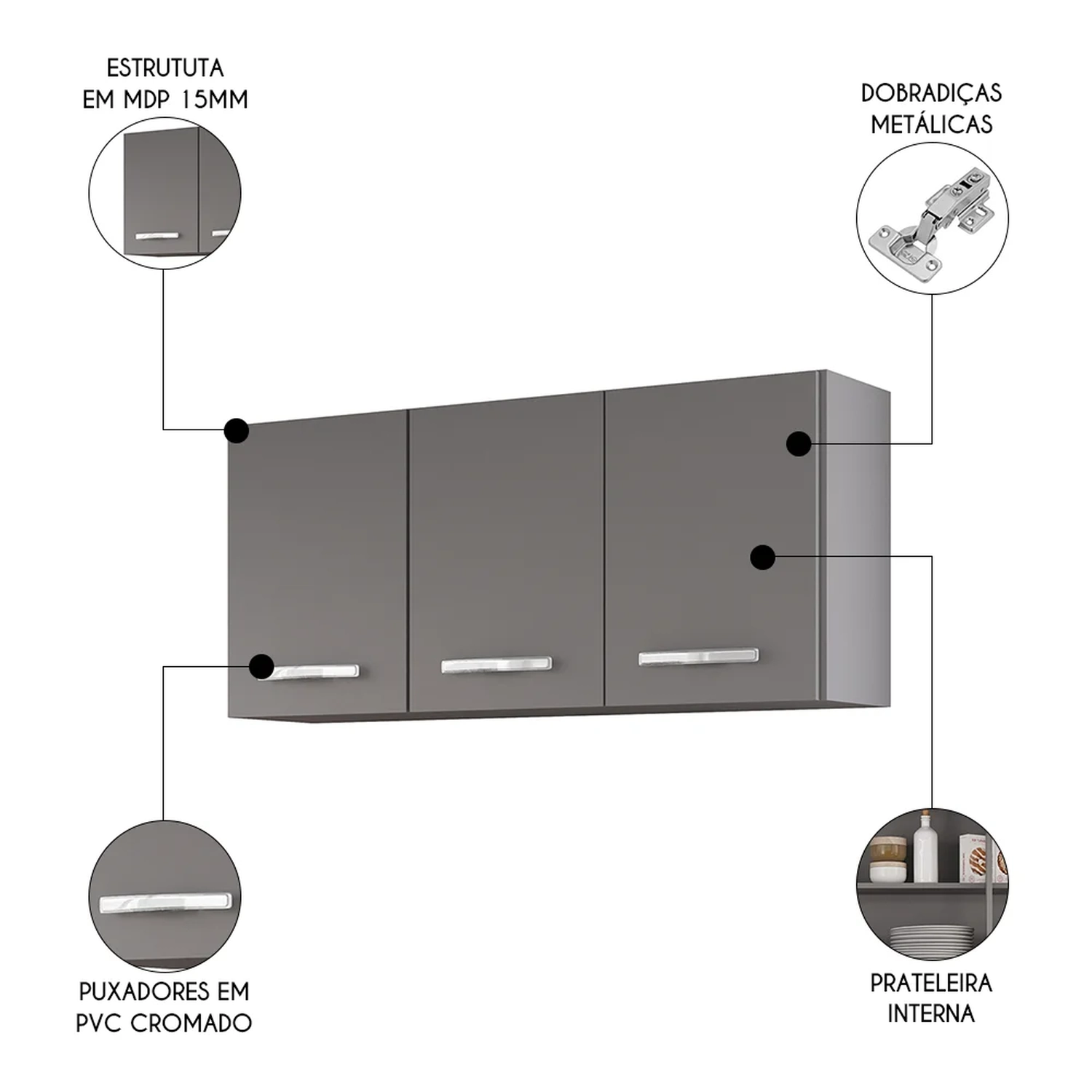 A escolha de móveis para Cozinha pequena é uma tarefa que exige atenção aos detalhes e uma compreensão clara das necessidades de espaço e funcionalidade. O Armário de Cozinha Aéreo 120cm 3 Portas Honduras Cinza, da Lumil é perfeito para esse caso.