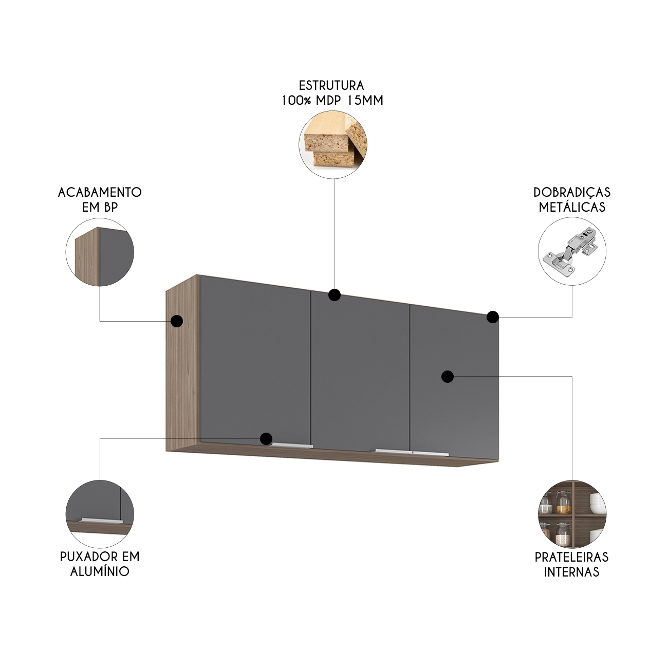 Dispondo de três portas com dobradiças metálicas, o Armário Aéreo garante abertura suave e se destaca por seu design sofisticado, os puxadores em alumínio conferem um toque de elegância ao ambiente. Sua estrutura em MDP 15mm com acabamento em BP, oferece resistência e durabilidade no uso, prolongando a vida útil do móvel. Com amplo espaço de armazenamento, o Armário de Cozinha possui prateleira interna para organizar seus utensílios de maneira eficiente. Não perca a chance de renovar a sua casa com um produto de alta qualidade.