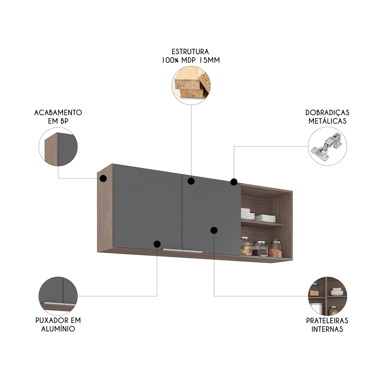 Dispondo de duas portas com dobradiças metálicas, o Armário Aéreo garante abertura suave, enquanto os puxadores em alumínio conferem um toque de elegância ao ambiente. Os dois nichos na lateral se destacam por trazer um design sofisticado, podendo expor utensílios decorativos, temperos ou outros objetos. Sua estrutura em MDP 15mm com acabamento em BP, oferece resistência e durabilidade no uso, prolongando a vida útil do móvel. Com amplo espaço de armazenamento, o Armário de Cozinha possui prateleira interna para manter todos os seus utensílios organizados de maneira eficiente. Não perca a chance de renovar a sua casa com um produto de alta qualidade.