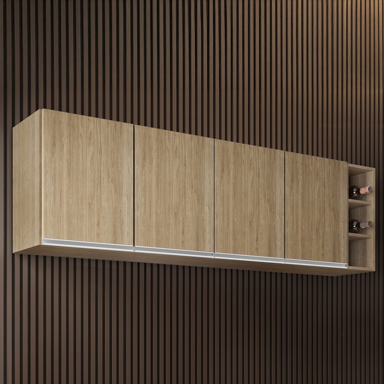O nicho garrafeiro complementa o design, sendo ótimo para expor itens decorativos ou bebidas, tornando sua Cozinha Moderna mais funcional, charmosa e acolhedora.