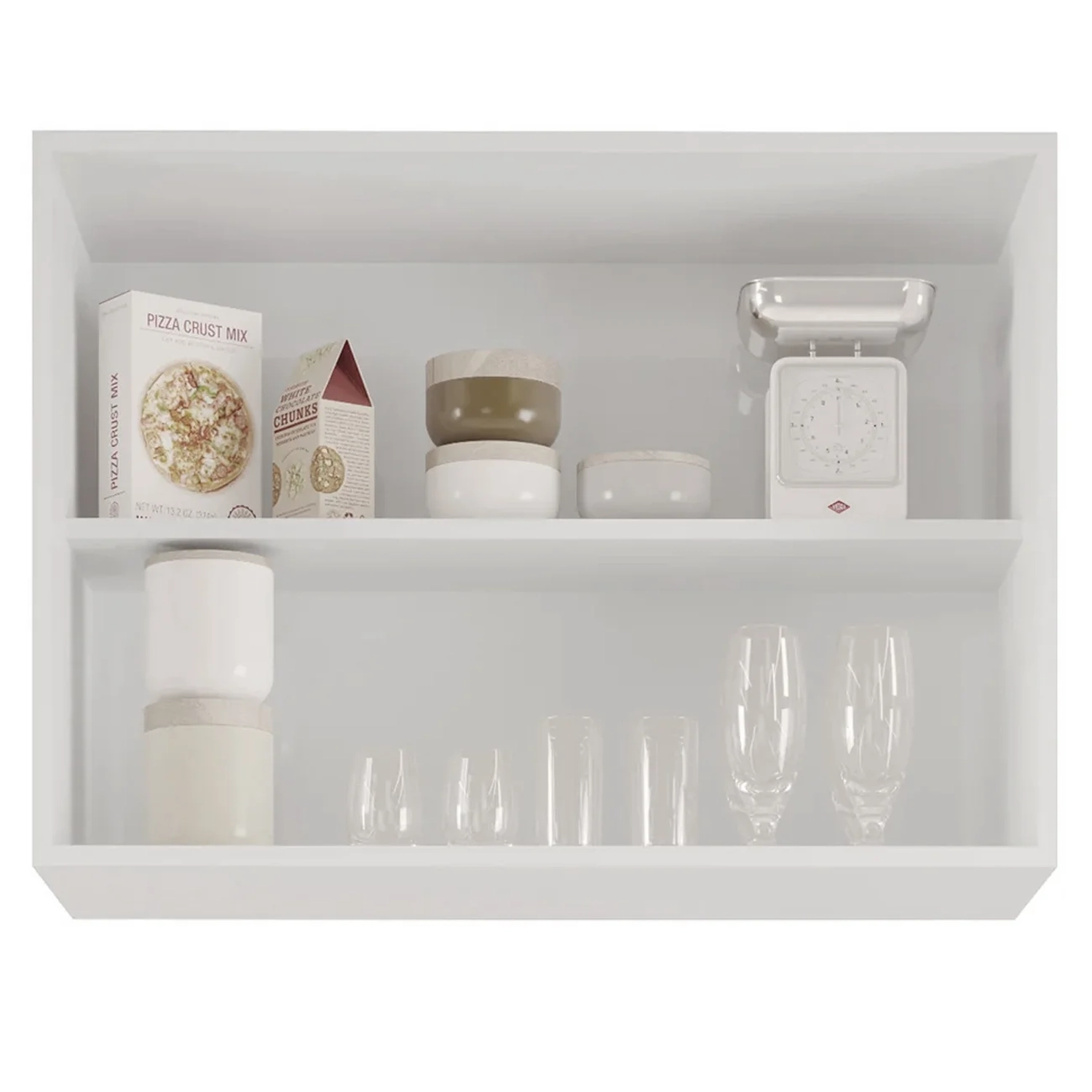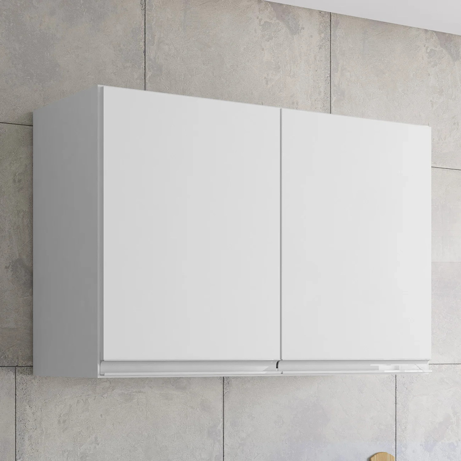 Conta com duas portas com dobradiças metálicas e puxadores em alumínio, que garantem abertura suave e resistência no uso diário. O espaço interno é dividido por uma prateleira, ideal para organizar louças, utensílios ou mantimentos com funcionalidade.