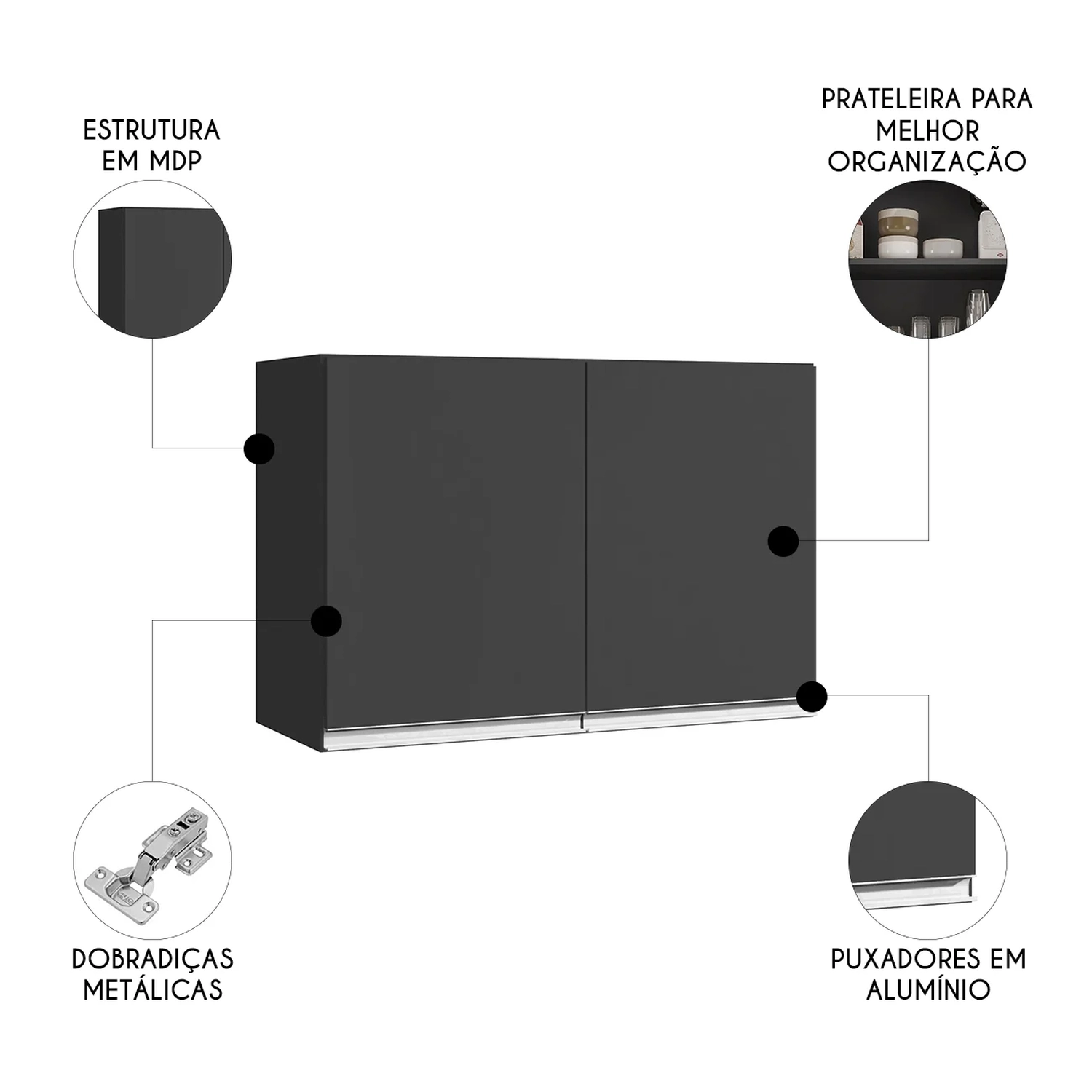 Armário de Cozinha Aéreo 80cm Com 2 Portas Andréia Preto - AJL Móveis