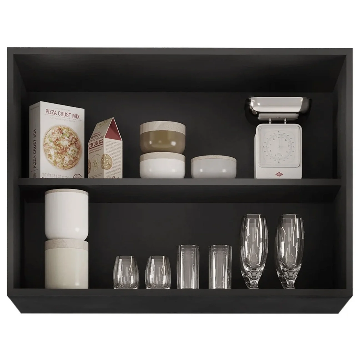 Conta com duas portas com dobradiças metálicas e puxadores em alumínio, que garantem abertura suave e resistência no uso diário. O espaço interno é dividido por uma prateleira, ideal para organizar louças, utensílios ou mantimentos com funcionalidade.
