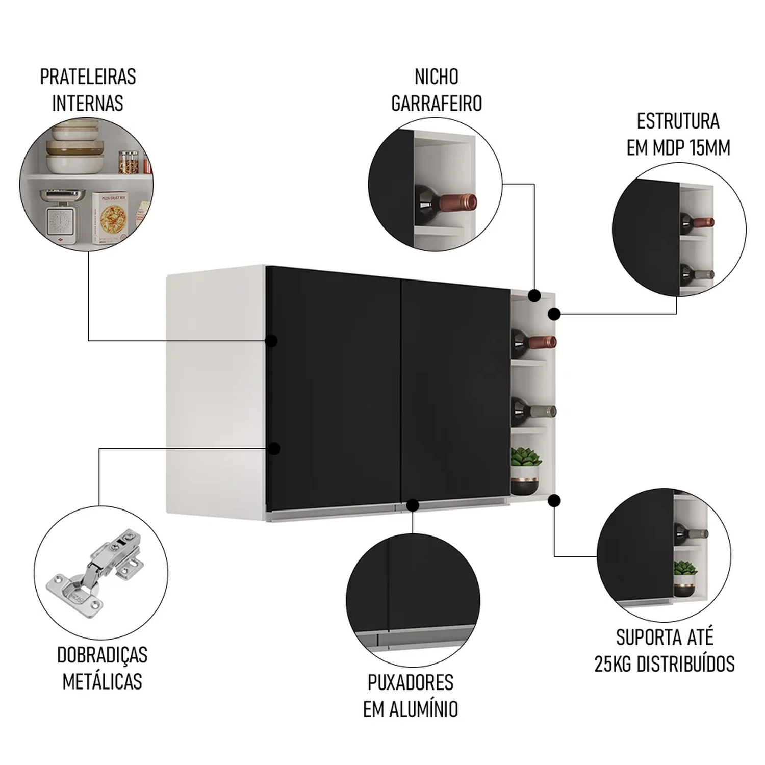 Se você está procurando um armário de cozinha que seja prático, funcional e bonito, o Armário de Cozinha Aéreo Califórnia 100cm e Nicho Garrafeiro Branco/Preto, da Lumil é a escolha ideal.