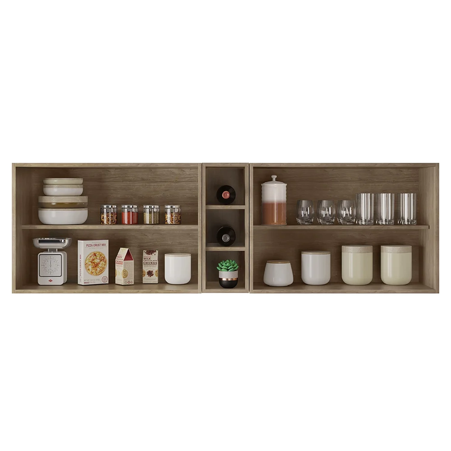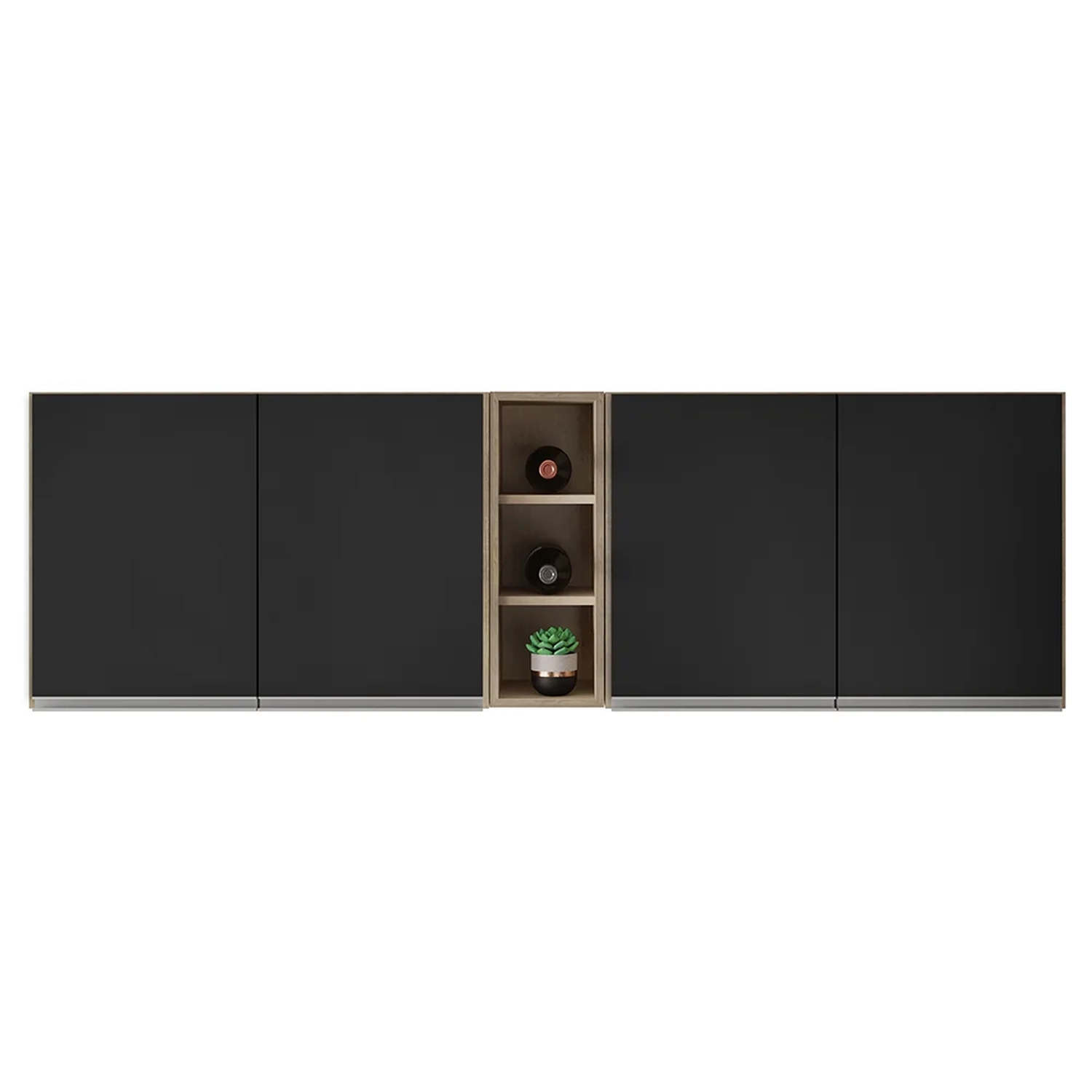 Eles são feitos de MDP, um material resistente e durável, com pintura BP que protege contra riscos e umidade. Os Armários Aéreos somam quatro portas cada, com dobradiças metálicas que garantem um fechamento suave e seguro. Eles também possuem uma prateleira interna, que permite aproveitar melhor o espaço interno. Os puxadores de alumínio são elegantes e fáceis de limpar. O kit acompanha o Nicho Garrafeiro Riad que tem capacidade para até três garrafas, ideal para guardar seus vinhos ou outras bebidas preferidas. Ele pode ser usado no meio ou nas laterais dos armários, de acordo com o seu gosto e necessidade. Um kit prático, bonito e funcional que vai deixar a sua Cozinha mais charmosa e aconchegante.