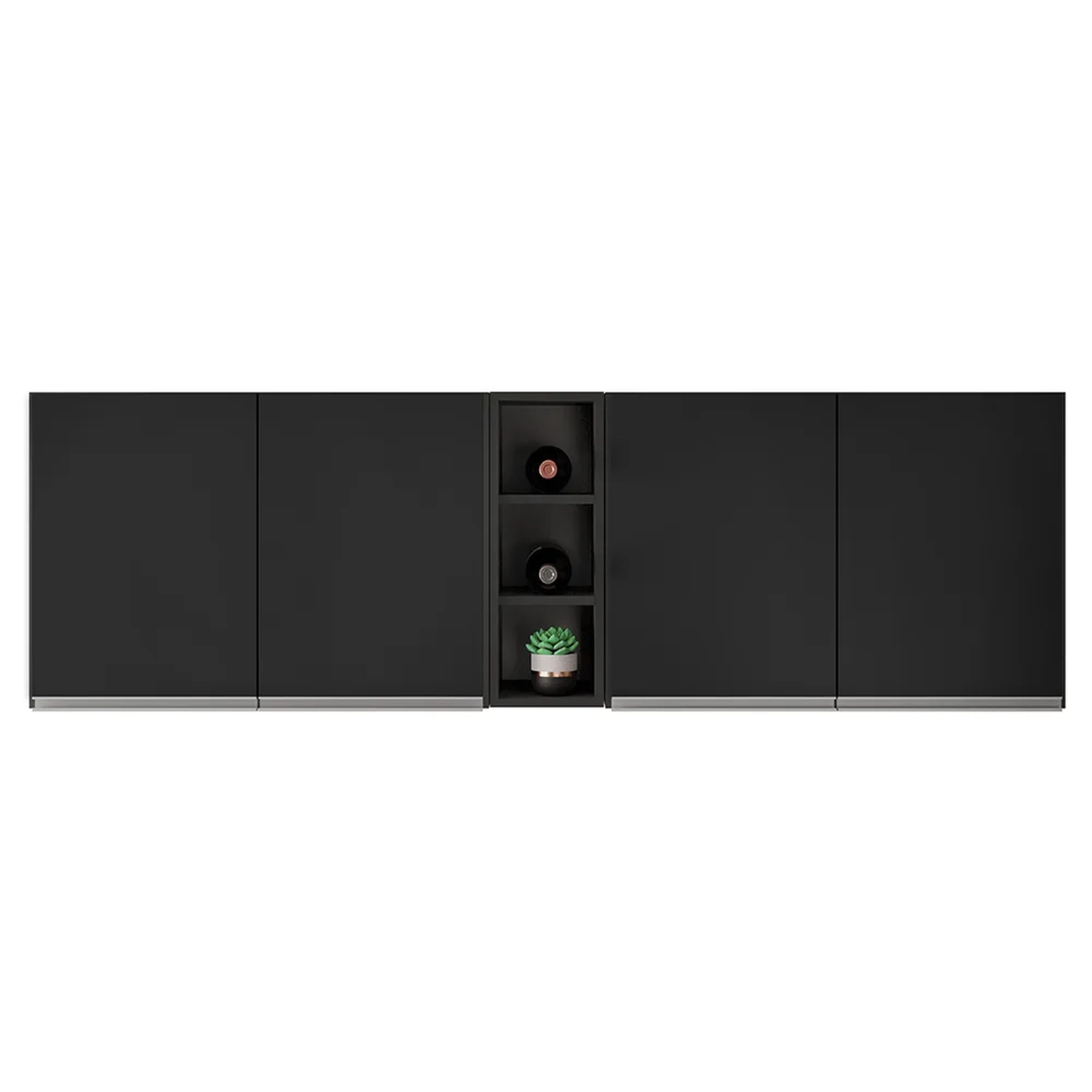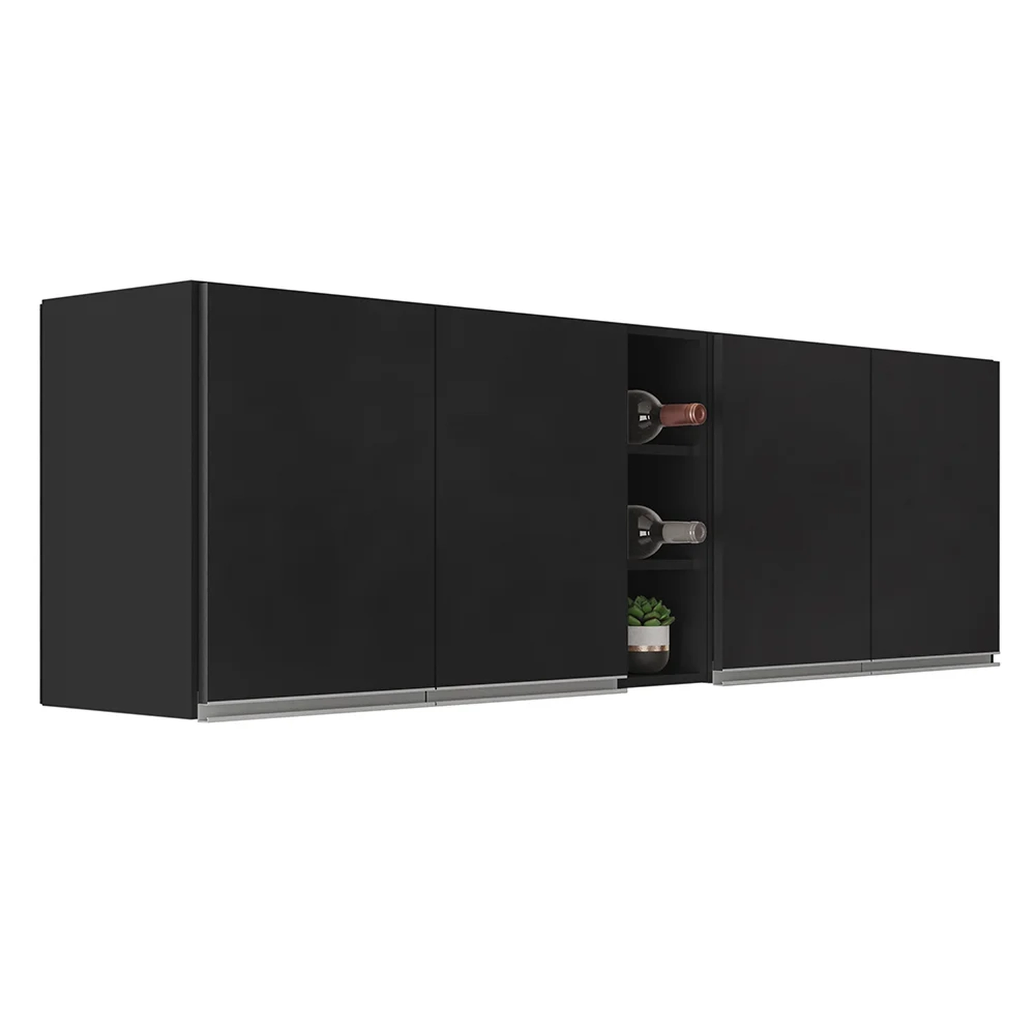 Eles são feitos de MDP, um material resistente e durável, com pintura BP que protege contra riscos e umidade. Os Armários Aéreos somam quatro portas cada, com dobradiças metálicas que garantem um fechamento suave e seguro. Eles também possuem uma prateleira interna, que permite aproveitar melhor o espaço interno. Os puxadores de alumínio são elegantes e fáceis de limpar. O kit acompanha o Nicho Garrafeiro Riad que tem capacidade para até três garrafas, ideal para guardar seus vinhos ou outras bebidas preferidas. Ele pode ser usado no meio ou nas laterais dos armários, de acordo com o seu gosto e necessidade. Um kit prático, bonito e funcional que vai deixar a sua Cozinha mais charmosa e aconchegante.