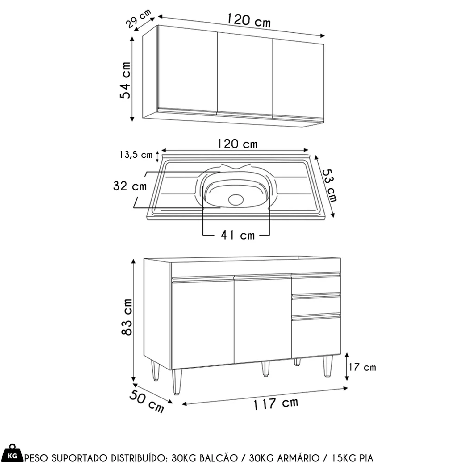 Peso Suportado Distribuído: Aéreo 30 kg/Balcão 30Kg/Pia 15Kg.