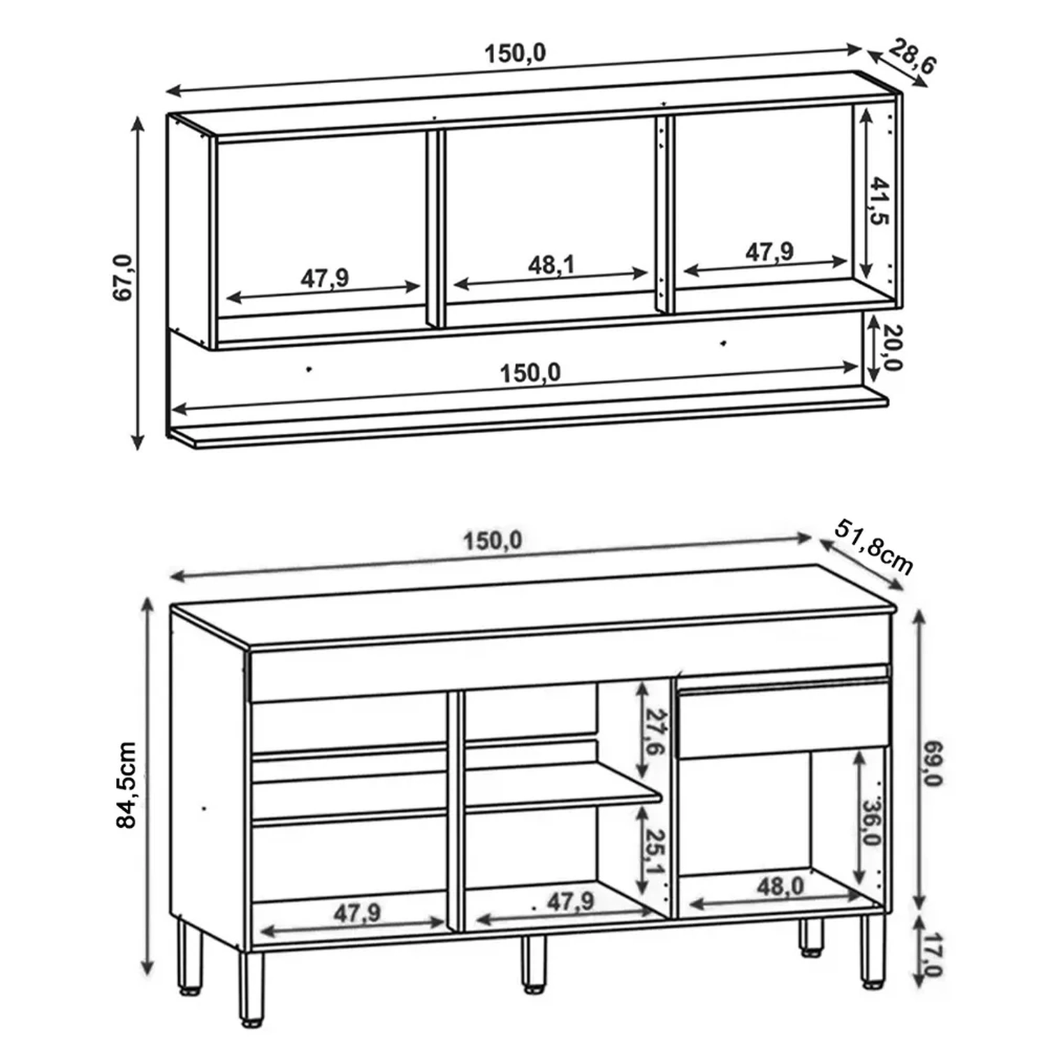 Armário Aéreo: 150 x 67 x 28,6 cm.