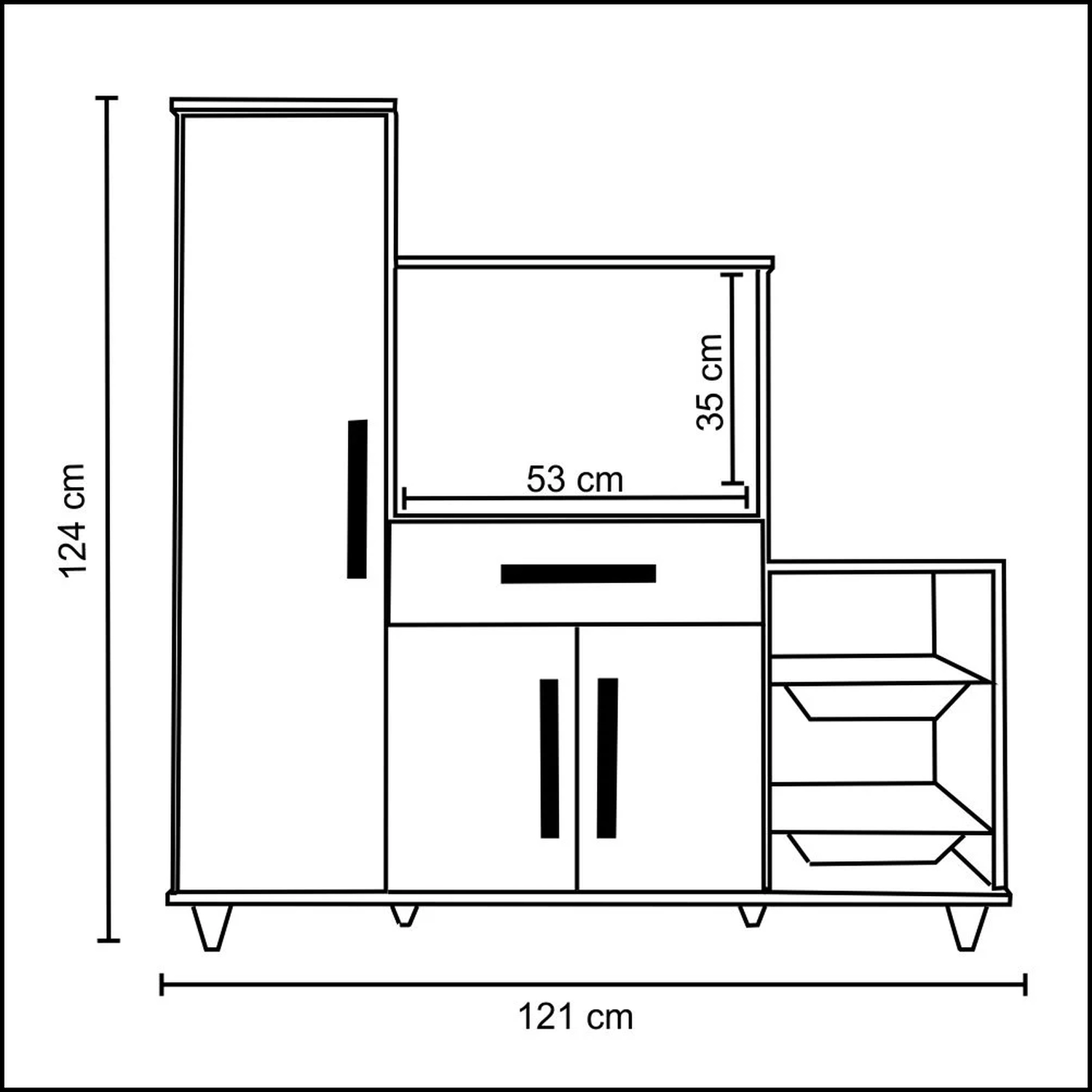 O armário possui um nicho ideal para micro-ondas ou forno elétrico, uma gaveta com corrediças metálicas, três portas convencionais com dobradiças metálicas e dois cestos para frutas, proporcionando muito mais espaço e funcionalidade. Esse Armário para Micro-ondas conta com sua estrutura em MDP com revestimento BP que assegura alta durabilidade, enquanto os puxadores cromados em PVC conferem um design moderno e sofisticado. O Armário Multiuso é perfeito para otimizar o espaço da sua Cozinha, oferecendo duas prateleiras para organização dos utensílios, além de adicionar um toque elegante ao ambiente.