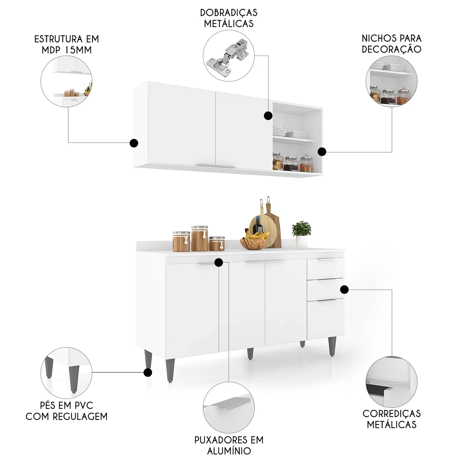 Conteúdo da Embalagem: 1 Armário Aéreo, 1 Balcão, 1 Tampo.