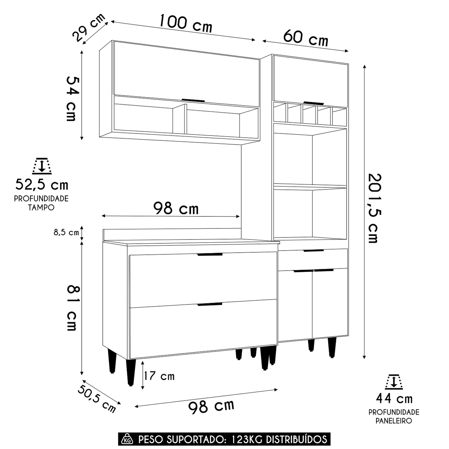 Conteúdo da Embalagem: 1 Armário Aéreo, 1 Balcão, 1 Paneleiro, 1 Tampo.