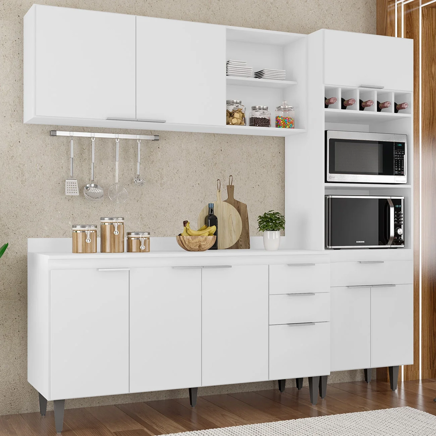 O Paneleiro conta com dois compartimentos para acomodar micro-ondas e forno elétrico, e cinco nichos na parte superior. Ele também inclui três portas, sendo uma delas basculante, além de uma gaveta. O Armário Aéreo vem com duas portas, dois nichos laterais e uma prateleira interna, para auxiliar na organização dos seus utensílios de forma prática e eficiente. Já o Balcão Gabinete dispõe de quatro portas e duas gavetas, com uma prateleira interna que oferece amplo espaço de armazenamento. Todos os móveis possuem estrutura em MDP 15mm, com acabamento em BP, puxadores em alumínio, dobradiças e corrediças metálicas, que garantem máxima resistência no uso diário. O tampo serve como apoio para eletrodomésticos ou no preparo dos alimentos, e o rodatampo que é um excelente acabamento entre o balcão e a parede. Os pés em PVC, são reguláveis, permitindo ajustar pequenos desníveis de piso. Este Armário de Cozinha é a solução ideal para otimizar sua casa, combinando materiais de alta qualidade com um design sofisticado.