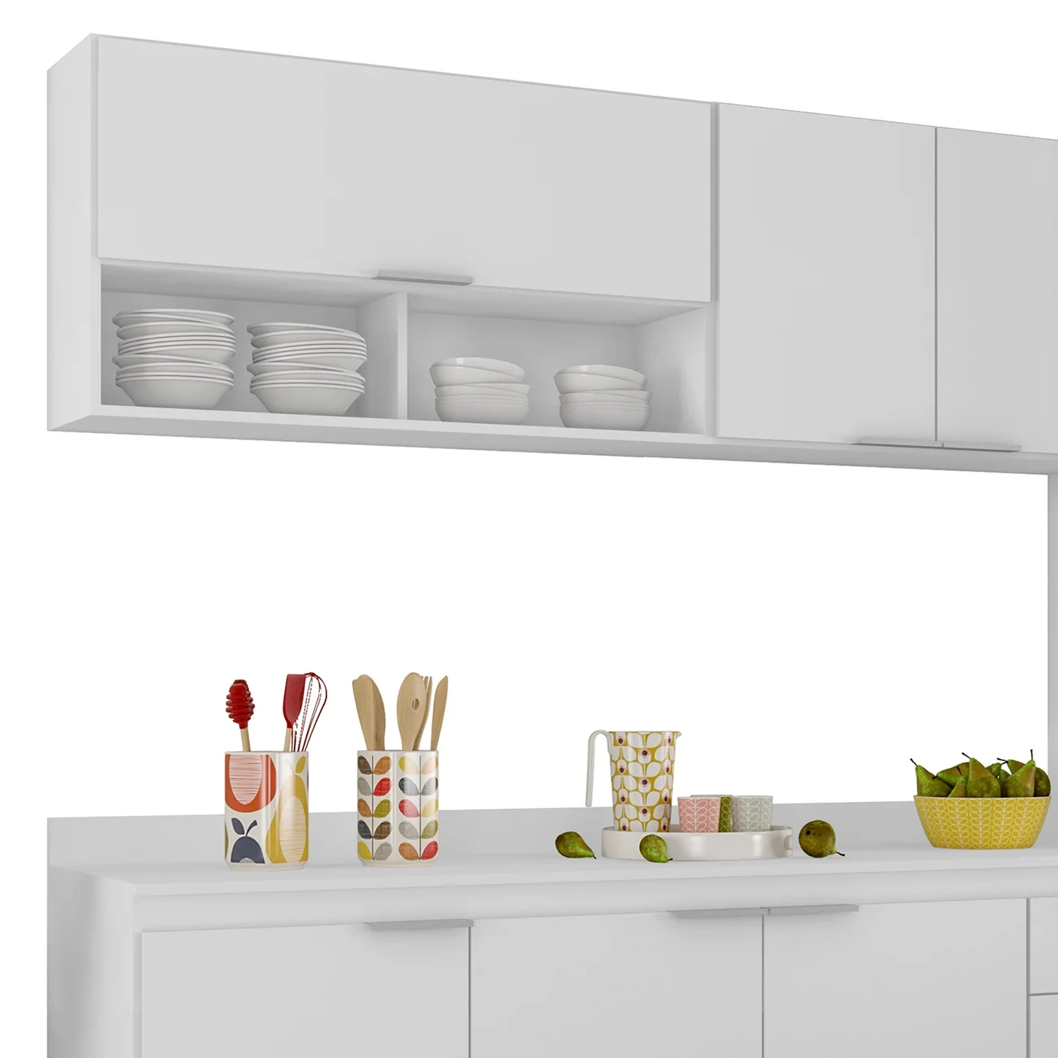 Conteúdo da Embalagem: 1 Armário Aéreo 100cm, 1 Armário Aéreo 80cm, 1 Balcão, 1 Paneleiro, 1 Tampo.