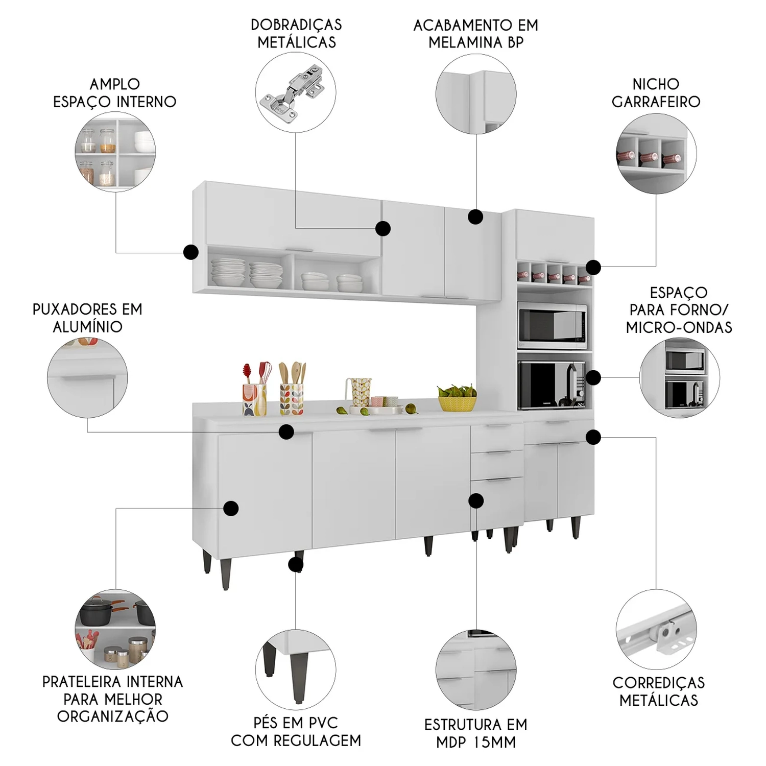 - Nichos para micro-ondas e forno elétrico.