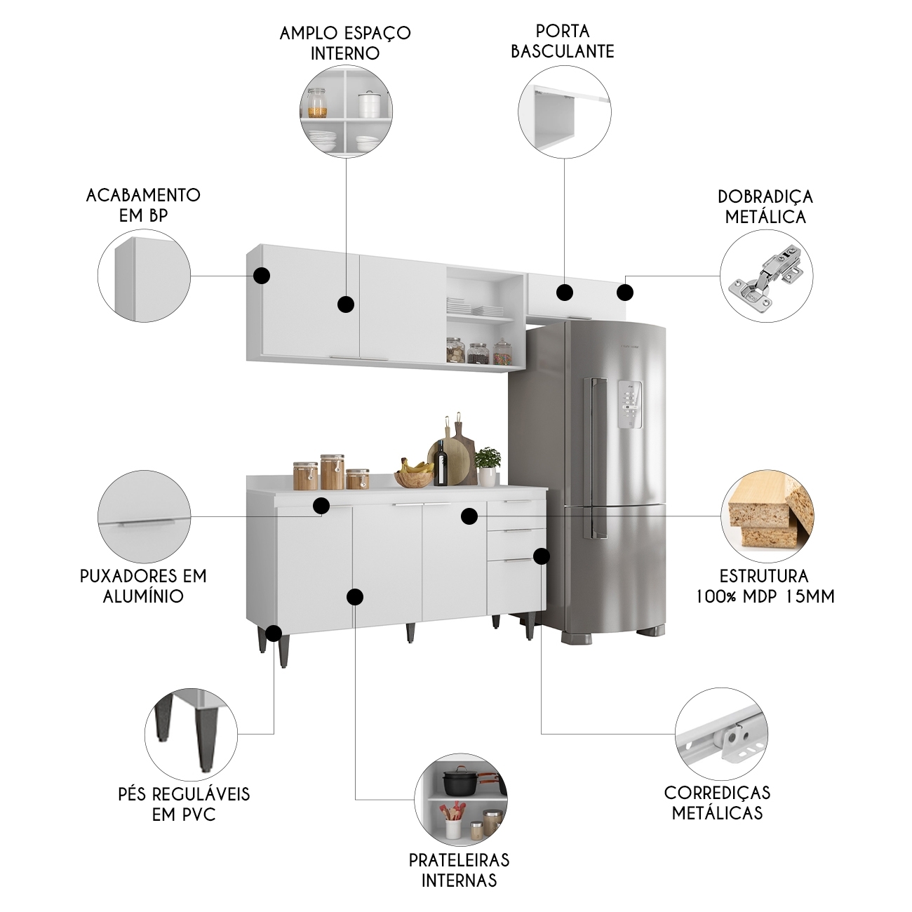 Conteúdo da Embalagem: 1 Armário Aéreo 150cm, 1 Armário Aéreo 70cm, 1 Balcão, 1 Tampo.
