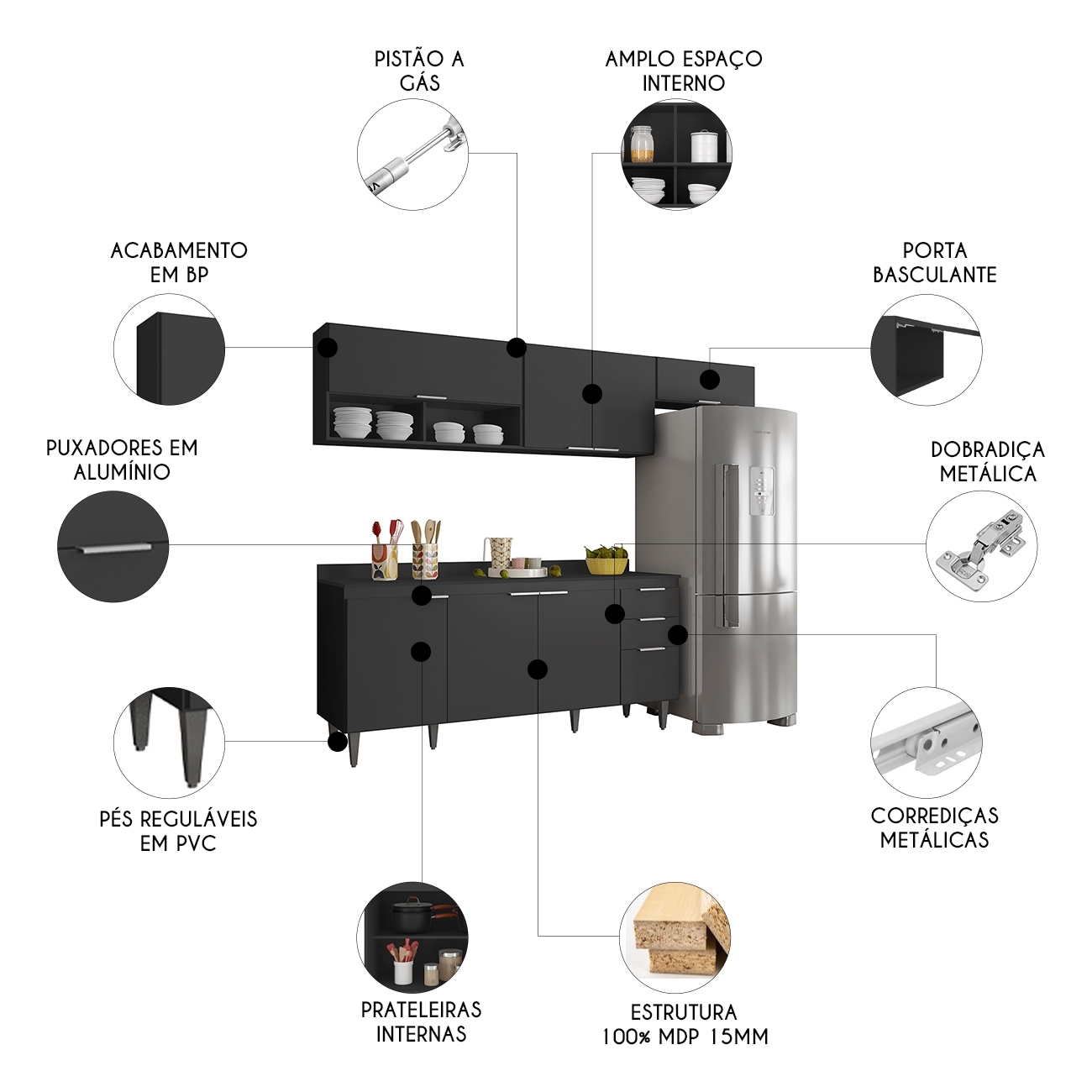 O Armário Aéreo 100cm vem com uma porta com pistão a gás e dois nichos, que se destacam na composição. O Armário de Geladeira também com uma porta, é um ótimo complemento, agregando praticidade e estilo. Enquanto o Armário Aéreo 80cm conta com duas portas convencionais, com uma prateleira interna para auxiliar na organização dos seus utensílios de forma prática e eficiente. Já o Balcão Gabinete dispõe de quatro portas e duas gavetas, com uma prateleira interna, oferecendo amplo espaço de armazenamento. Todos os móveis possuem estrutura em MDP 15mm, com acabamento em BP, puxadores em alumínio, dobradiças e corrediças metálicas, que garantem máxima resistência no uso diário. O tampo serve como apoio para eletrodomésticos ou no preparo dos alimentos, e o rodatampo que é um excelente acabamento entre o balcão e a parede. Os pés em PVC, são reguláveis, permitindo ajustar pequenos desníveis de piso. Este Armário de Cozinha é a solução ideal para otimizar sua casa, combinando materiais de alta qualidade com um design sofisticado.