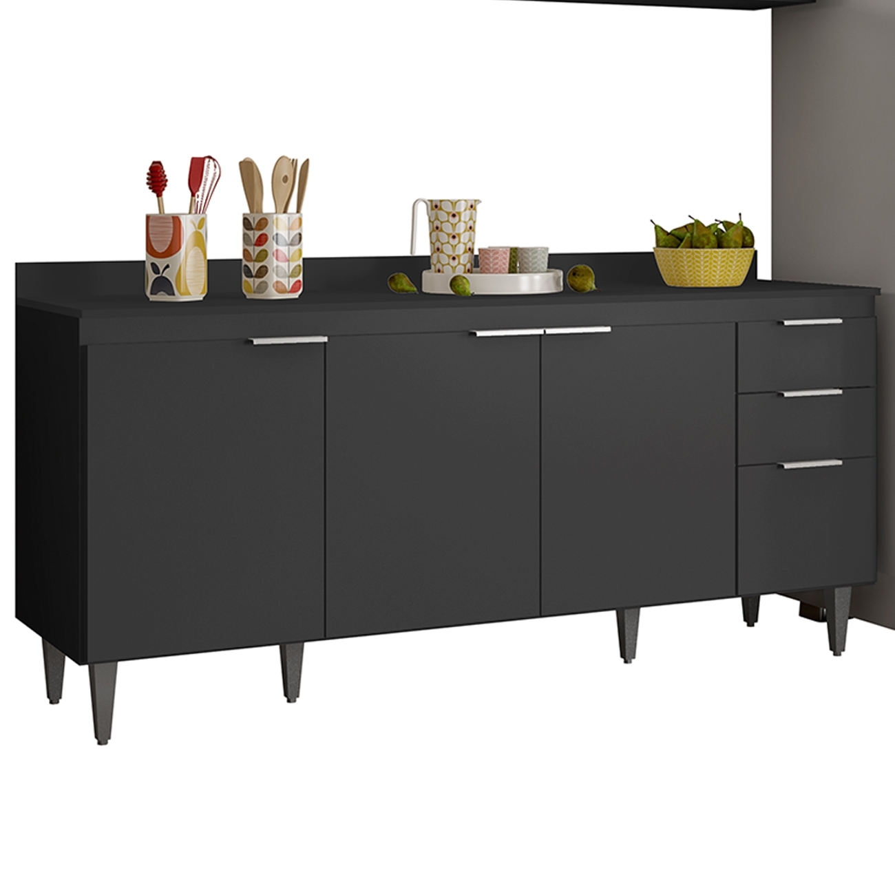 Conteúdo da Embalagem: 1 Armário Aéreo 100cm, 1 Armário Aéreo 80cm, 1 Armário Aéreo 70cm, 1 Balcão, 1 Tampo.