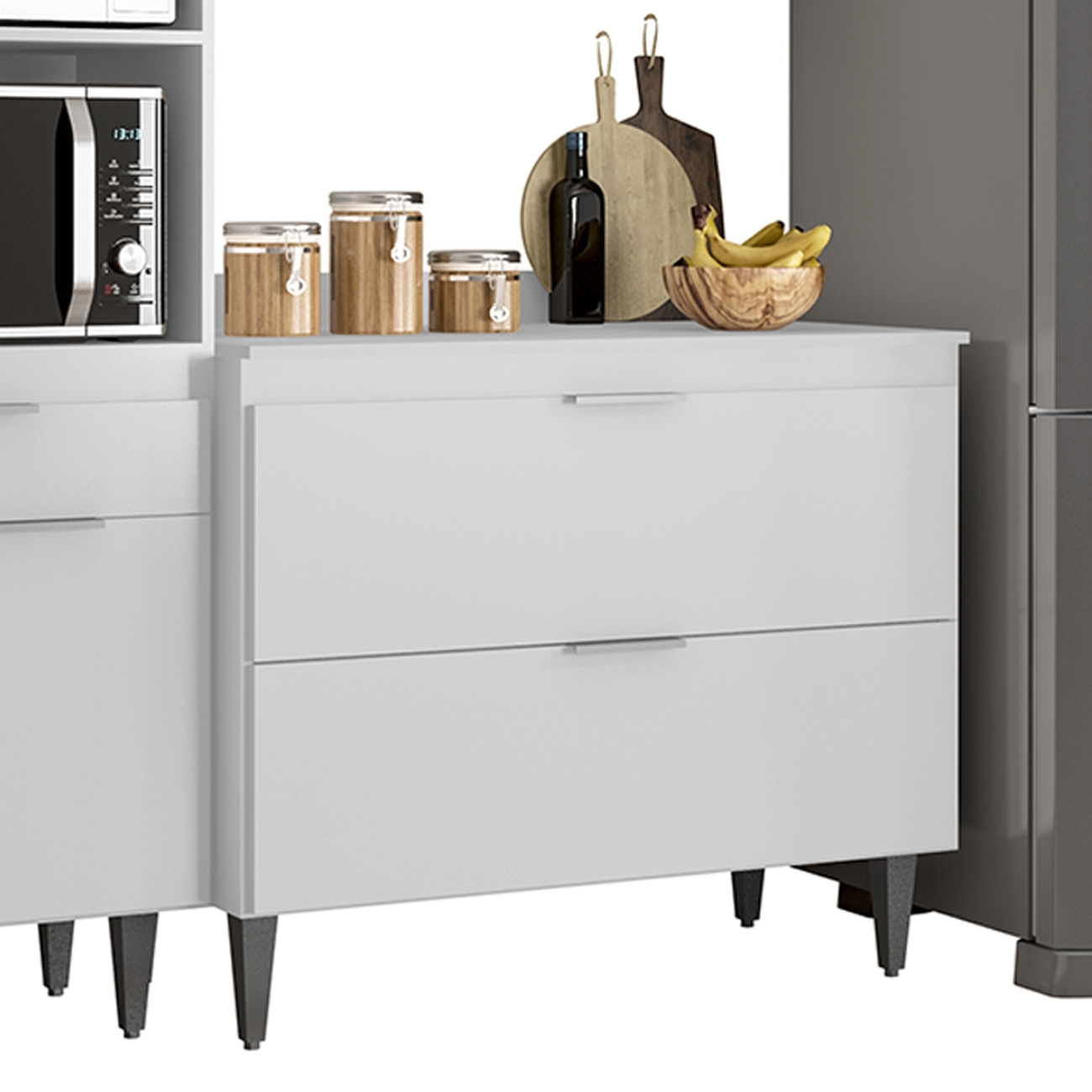 O Paneleiro conta com dois compartimentos para acomodar micro-ondas e forno elétrico, e cinco nichos na parte superior. Ele também inclui três portas, sendo uma delas basculante, além de uma gaveta para melhor organização dos seus utensílios. O Armário Aéreo 100cm vem com uma porta basculante com pistão a gás e dois nichos, que se destacam com elegância na composição do ambiente. Enquanto o Armário de Geladeira, também com uma porta, é um ótimo complemento, agregando praticidade e estilo. Já o Balcão Gabinete dispõe de duas portas basculantes com fecho trava de segurança, que permite o fechamento com um simples toque. Todos os móveis possuem estrutura em MDP 15mm, com acabamento em BP, puxadores em alumínio, dobradiças e corrediças metálicas, que garantem máxima resistência no uso diário. O tampo serve como apoio para eletrodomésticos ou no preparo dos alimentos, e o rodatampo que é um excelente acabamento entre o balcão e a parede. Os pés em PVC, são reguláveis, permitindo ajustar pequenos desníveis de piso. Este Armário de Cozinha é a solução ideal para otimizar sua casa, combinando materiais de alta qualidade com um design sofisticado.