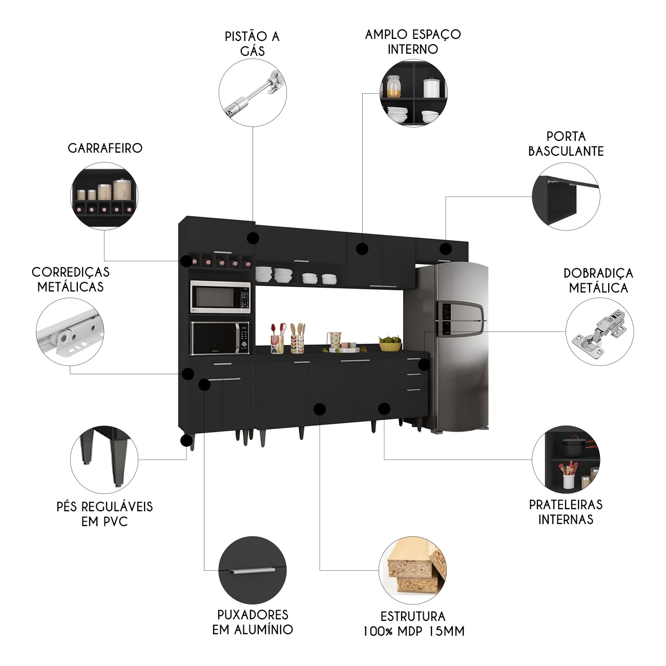 Características do Produto Material da Estrutura: MDP 15mm. Material do fundo: HDF 3mm. Peso Suportado: 156 Kg distribuídos. Acompanha Pia: Não. Acompanha Tampo: Sim. Acabamento: Melamina BP. Escala de brilho: Fosco. Possui Portas: Sim. Quantidade de Portas: 11 Portas. Tipo de Porta: Convencional/Basculante. Tipo de Dobradiças: Metálicas. Possui Gavetas: Sim. Quantidade de Gavetas: 3 Gavetas. Tipo de Corrediças: Metálicas. Possui Puxador: Sim. Material do Puxador: Alumínio. Possui Prateleiras: Sim. Quantidade de Prateleiras: 2 Prateleiras. Possui Nichos: Sim. Quantidade de Nichos: 9 Nichos. Possui Pés: Sim. Quantidade de Pés: 10 Pés. Material dos Pés: PVC. Altura dos Pés: 17cm com regulagem. Diferenciais: