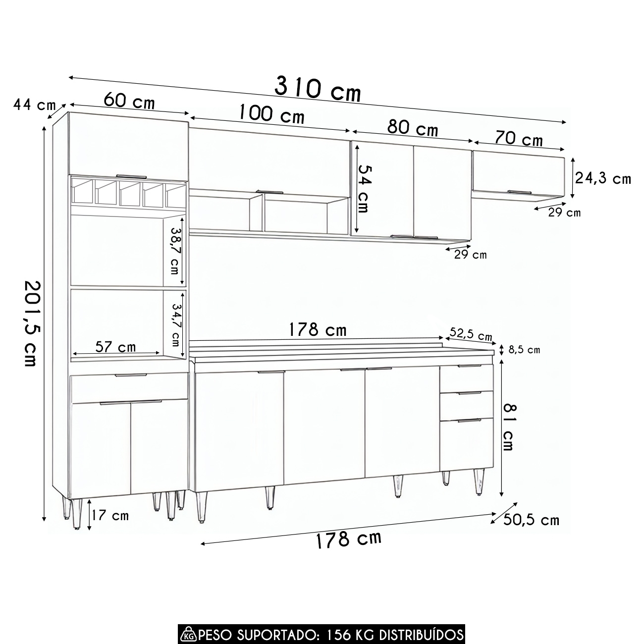 Outras medidas: (L x A x P) Armário Aéreo 100cm: 100 x 54 x 29 cm. Armário Aéreo 80cm: 80 x 54 x 29 cm. Armário Aéreo 70cm: 70 x 24,3 x 29 cm. Balcão 178 x 81 x 50,5 cm. Paneleiro: 60 x 201,5 x 44 cm. Tampo: 178 x 8,5 x 52,5 cm.