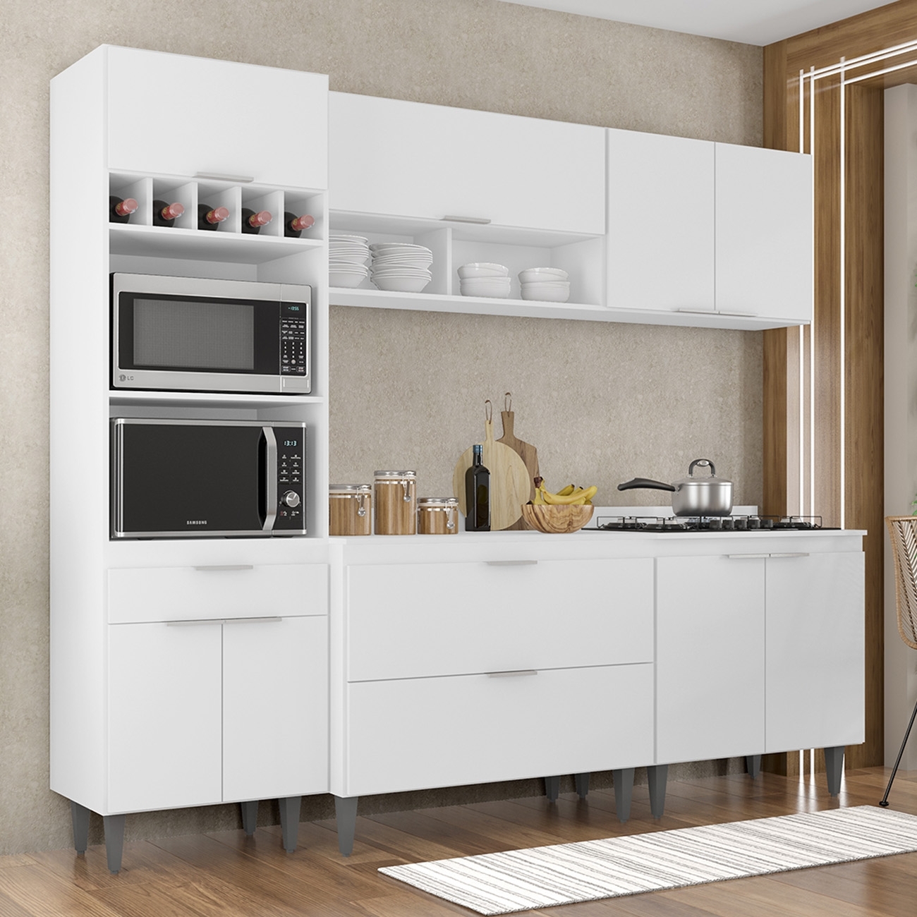 O Paneleiro conta com dois compartimentos para acomodar micro-ondas e forno elétrico, e cinco nichos na parte superior. Ele também inclui três portas, sendo uma delas basculante, além de uma gaveta para melhor organização dos seus utensílios. O Armário Aéreo 100cm possui uma porta basculante com pistão a gás e dois nichos, que se destacam com elegância. O Armário Aéreo 80cm dispõe de duas portas convencionais, com uma prateleira interna, agregando praticidade e estilo. Já o Balcão Gabinete vem com duas portas basculantes com fecho trava de segurança, que permite o fechamento com um simples toque. Enquanto o Balcão 80cm com Tampo conta com duas portas convencionais, com uma prateleira interna, oferecendo amplo espaço de armazenamento. Todos os móveis possuem estrutura em MDP 15mm, com acabamento em BP, puxadores em alumínio, dobradiças e corrediças metálicas, que garantem máxima resistência no uso diário. O tampo serve como apoio para eletrodomésticos ou no preparo dos alimentos, e o rodatampo que é um excelente acabamento entre o balcão e a parede. Os pés em PVC, são reguláveis, permitindo ajustar pequenos desníveis de piso. Este Armário de Cozinha é a solução ideal para otimizar sua casa, combinando materiais de alta qualidade com um design sofisticado.