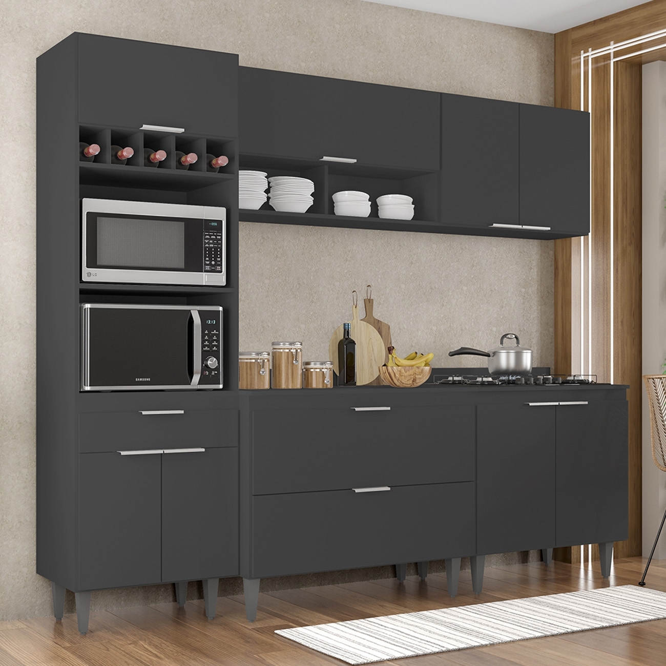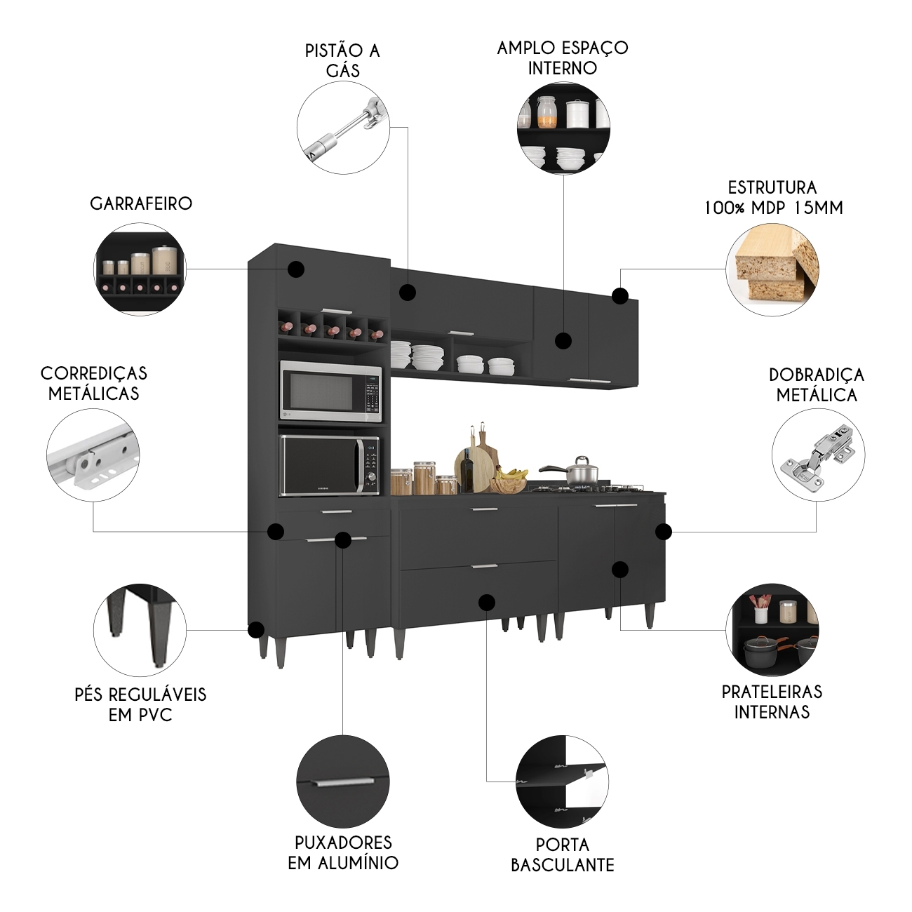 O Paneleiro conta com dois compartimentos para acomodar micro-ondas e forno elétrico, e cinco nichos na parte superior. Ele também inclui três portas, sendo uma delas basculante, além de uma gaveta para melhor organização dos seus utensílios. O Armário Aéreo 100cm possui uma porta basculante com pistão a gás e dois nichos, que se destacam com elegância. O Armário Aéreo 80cm dispõe de duas portas convencionais, com uma prateleira interna, agregando praticidade e estilo. Já o Balcão Gabinete vem com duas portas basculantes com fecho trava de segurança, que permite o fechamento com um simples toque. Enquanto o Balcão 80cm com Tampo conta com duas portas convencionais, com uma prateleira interna, oferecendo amplo espaço de armazenamento. Todos os móveis possuem estrutura em MDP 15mm, com acabamento em BP, puxadores em alumínio, dobradiças e corrediças metálicas, que garantem máxima resistência no uso diário. O tampo serve como apoio para eletrodomésticos ou no preparo dos alimentos, e o rodatampo que é um excelente acabamento entre o balcão e a parede. Os pés em PVC, são reguláveis, permitindo ajustar pequenos desníveis de piso. Este Armário de Cozinha é a solução ideal para otimizar sua casa, combinando materiais de alta qualidade com um design sofisticado.