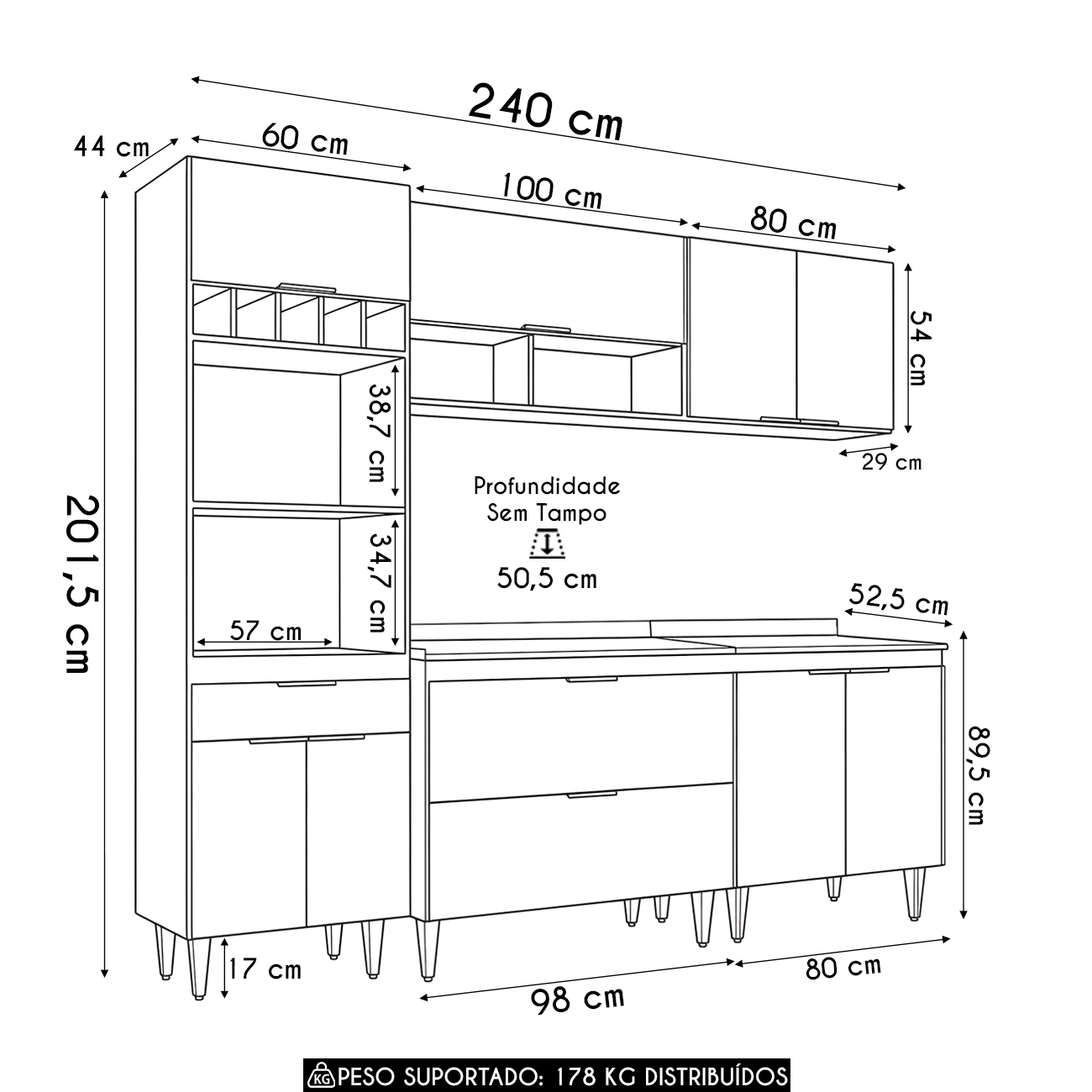 Conteúdo da Embalagem: 1 Armário Aéreo 100cm, 1 Armário Aéreo 80cm, 1 Balcão 100cm, 1 Balcão 80cm, 1 Paneleiro, 1 Tampo.