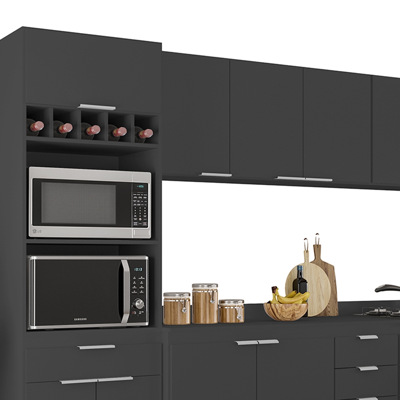 O Paneleiro conta com dois compartimentos para acomodar micro-ondas e forno elétrico, e cinco nichos na parte superior. Ele também inclui três portas, sendo uma delas basculante, além de uma gaveta para melhor organização dos seus utensílios. Os Armários Aéreos dispõe de cinco portas e duas prateleiras internas, oferecendo praticidade e estilo. Já o Balcão Gabinete e o Balcão 80cm possuem cinco portas e duas gavetas, com duas prateleiras internas que proporcionam amplo espaço de armazenamento. Todos os móveis possuem estrutura em MDP 15mm, com acabamento em BP, puxadores em alumínio, dobradiças e corrediças metálicas, que garantem máxima resistência no uso diário. O tampo serve como apoio para eletrodomésticos ou no preparo dos alimentos, e o rodatampo que é um excelente acabamento entre o balcão e a parede. Os pés em PVC, são reguláveis, permitindo ajustar pequenos desníveis de piso. O balcão gabinete não acompanha tampo para que o uso fique opcional com tampo ou pia. Este Armário de Cozinha é a solução ideal para otimizar sua casa, combinando materiais de alta qualidade com um design sofisticado.