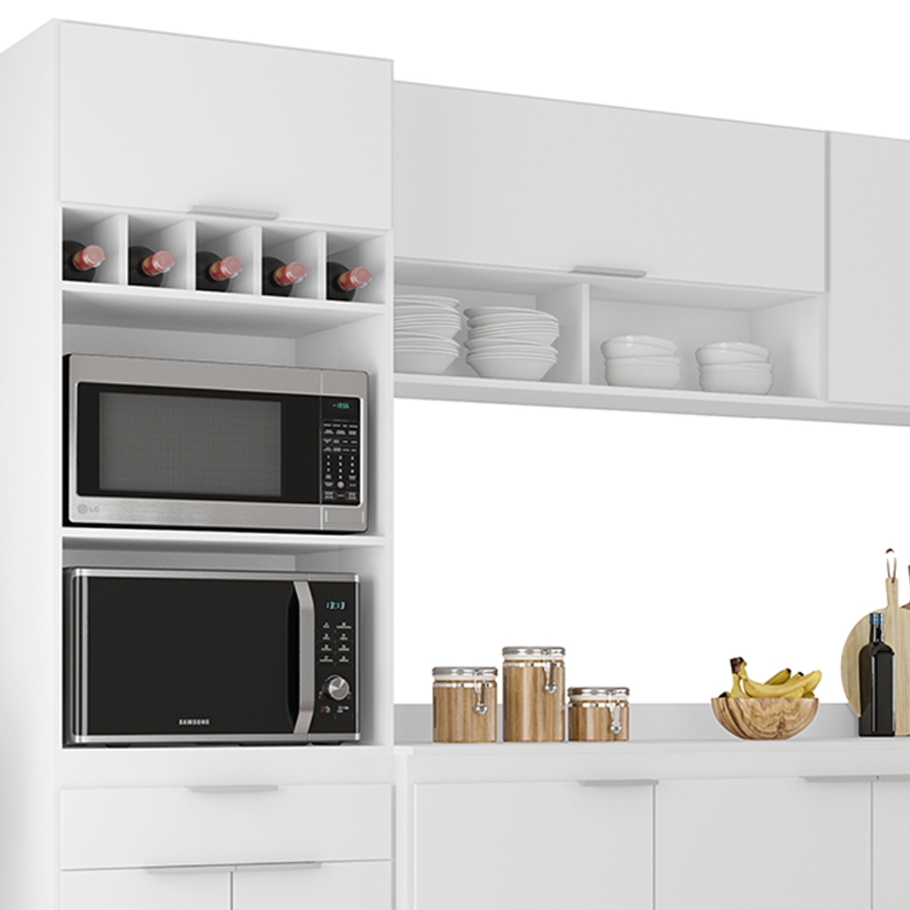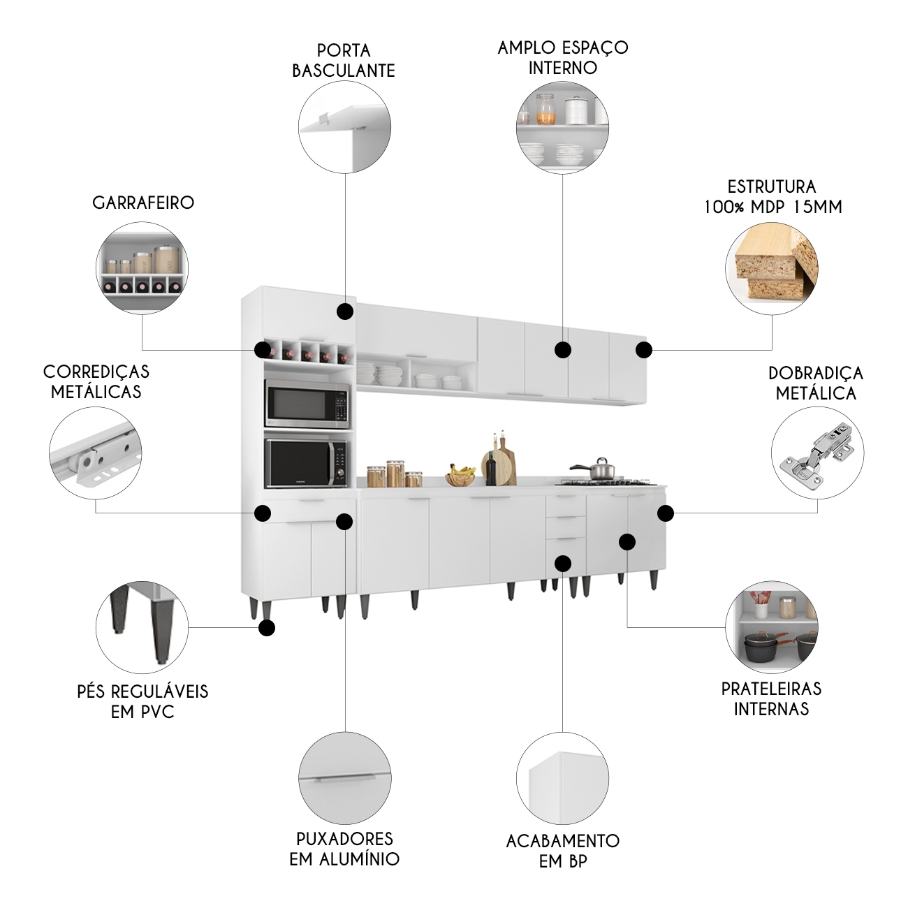 O Paneleiro conta com dois compartimentos para acomodar micro-ondas e forno elétrico, e cinco nichos na parte superior. Ele também inclui três portas, sendo uma delas basculante, além de uma gaveta para melhor organização dos seus utensílios. Os Armários Aéreos dispõe de quatro portas convencionais, uma porta basculante com pistão a gás, dois nichos e duas prateleiras internas, agregando praticidade e estilo. Já o Balcão Gabinete e o Balcão 80cm com Tampo possuem seis portas e duas gavetas, com duas prateleiras internas que oferecem amplo espaço de armazenamento. Todos os móveis possuem estrutura em MDP 15mm, com acabamento em BP, puxadores em alumínio, dobradiças e corrediças metálicas, que garantem máxima resistência no uso diário. O tampo serve como apoio para eletrodomésticos ou no preparo dos alimentos, e o rodatampo que é um excelente acabamento entre o balcão e a parede. Os pés em PVC, são reguláveis, permitindo ajustar pequenos desníveis de piso. Este Armário de Cozinha é a solução ideal para otimizar sua casa, combinando materiais de alta qualidade com um design sofisticado.