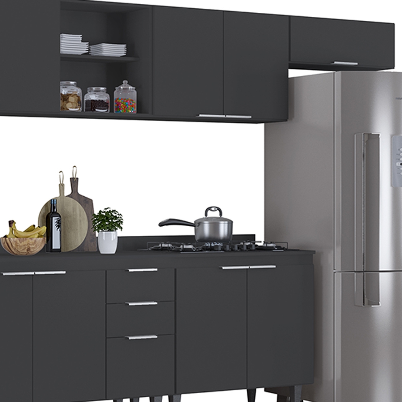 Conteúdo da Embalagem: 1 Armário Aéreo 150cm, 1 Armário Aéreo 80cm, 1 Armário Aéreo 70cm, 1 Balcão 150cm, 1 Balcão 80cm, 1 Paneleiro, 1 Tampo.