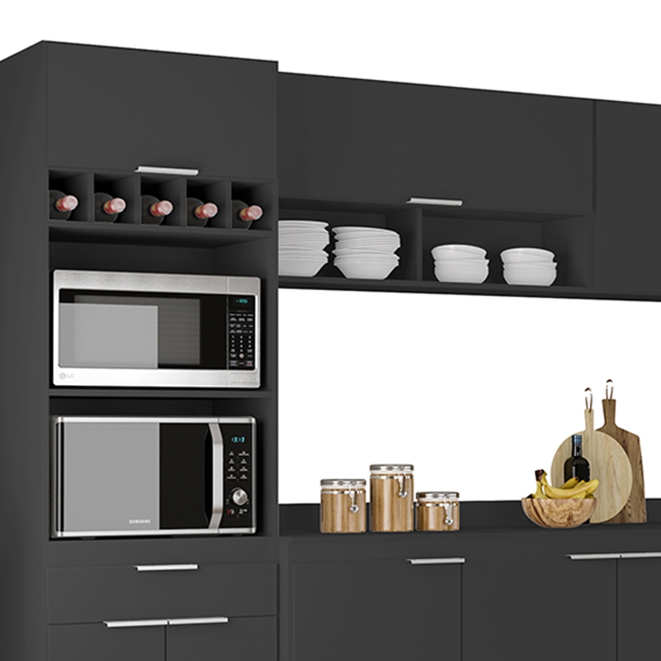 O Paneleiro conta com dois compartimentos para acomodar micro-ondas e forno elétrico, e cinco nichos na parte superior. Ele também inclui três portas, sendo uma delas basculante, além de uma gaveta para melhor organização dos seus utensílios. O Armário Aéreo 100cm vem com uma porta basculante com pistão a gás e dois nichos, que se destacam com elegância. O também com uma porta, é um ótimo complemento, agregando praticidade e estilo. Enquanto os Armários Aéreos 80cm contam com duas portas convencionais em cada, e duas prateleiras internas. Já o Balcão Gabinete e o Balcão 80cm com Tampo dispõe de seis portas e duas gavetas, com duas prateleiras internas que oferecem amplo espaço de armazenamento. Todos os móveis possuem estrutura em MDP 15mm, com acabamento em BP, puxadores em alumínio, dobradiças e corrediças metálicas, que garantem máxima resistência no uso diário. O tampo serve como apoio para eletrodomésticos ou no preparo dos alimentos, e o rodatampo que é um excelente acabamento entre o balcão e a parede. Os pés em PVC, são reguláveis, permitindo ajustar pequenos desníveis de piso. Este Armário de Cozinha é a solução ideal para otimizar sua casa, combinando materiais de alta qualidade com um design sofisticado.