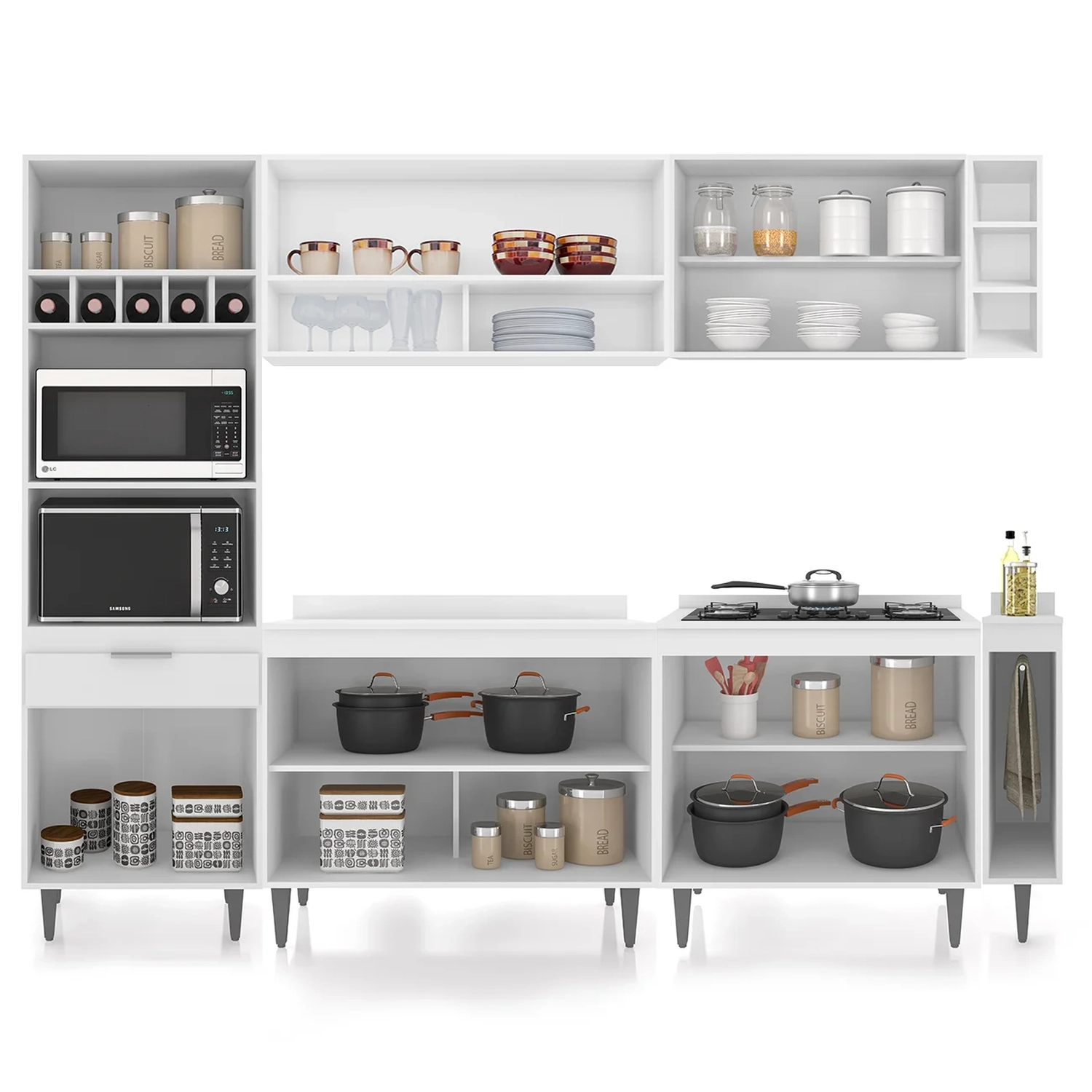 O Paneleiro conta com dois compartimentos para acomodar micro-ondas e forno elétrico, e cinco nichos na parte superior. Ele também inclui três portas, sendo uma delas basculante, além de uma gaveta para melhor organização dos seus utensílios. O Armário Aéreo 100cm possui uma porta basculante com pistão a gás e dois nichos, que se destacam com elegância. Já Armário Aéreo 80cm dispõe de duas portas convencionais, com uma prateleira interna. O Balcão Gabinete vem com duas portas basculantes com fecho trava de segurança, que permite o fechamento com um simples toque. Enquanto o Balcão 80cm com Tampo possui duas portas convencionais, com uma prateleira interna, oferecendo amplo espaço de armazenamento. Já o Balcão Porta Pano traz um suporte de aço para guardanapos e o nicho adega que conta com três repartições. Todos os móveis possuem estrutura em MDP 15mm, com acabamento em BP, puxadores em alumínio, dobradiças e corrediças metálicas, que garantem máxima resistência no uso diário. O tampo serve como apoio para eletrodomésticos ou no preparo dos alimentos, e o rodatampo que é um excelente acabamento entre o balcão e a parede. Os pés em PVC, são reguláveis, permitindo ajustar pequenos desníveis de piso. Este Armário de Cozinha é a solução ideal para otimizar sua casa, combinando materiais de alta qualidade com um design sofisticado.