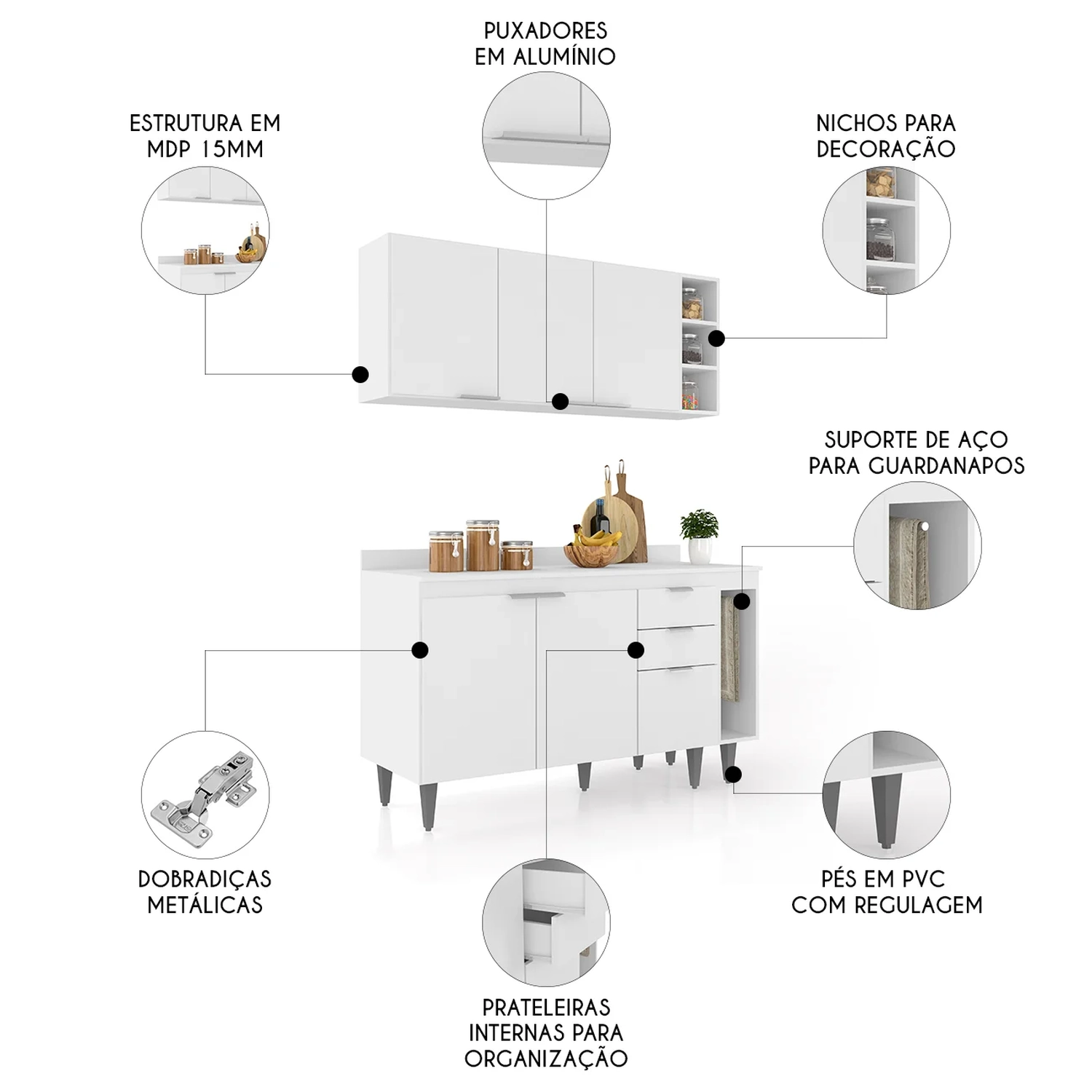 O Armário Aéreo vem com três portas e uma prateleira interna, oferecendo praticidade e estilo na organização dos seus utensílios. O Balcão Para Pia dispõe de três portas e duas gavetas, além de uma prateleira interna, que proporciona amplo espaço de armazenamento. Já o Balcão Porta Pano traz um suporte de aço para guardanapos, enquanto o nicho adega conta com três repartições. Todos os móveis possuem estrutura em MDP 15mm, com acabamento em BP, puxadores em alumínio, dobradiças e corrediças metálicas, que garantem máxima resistência no uso diário. O tampo serve como apoio para eletrodomésticos ou no preparo dos alimentos, e o rodatampo que é um excelente acabamento entre o balcão e a parede. Os pés em PVC, são reguláveis, permitindo ajustar pequenos desníveis de piso. Este Armário de Cozinha é a solução ideal para otimizar sua casa, combinando materiais de alta qualidade com um design sofisticado.