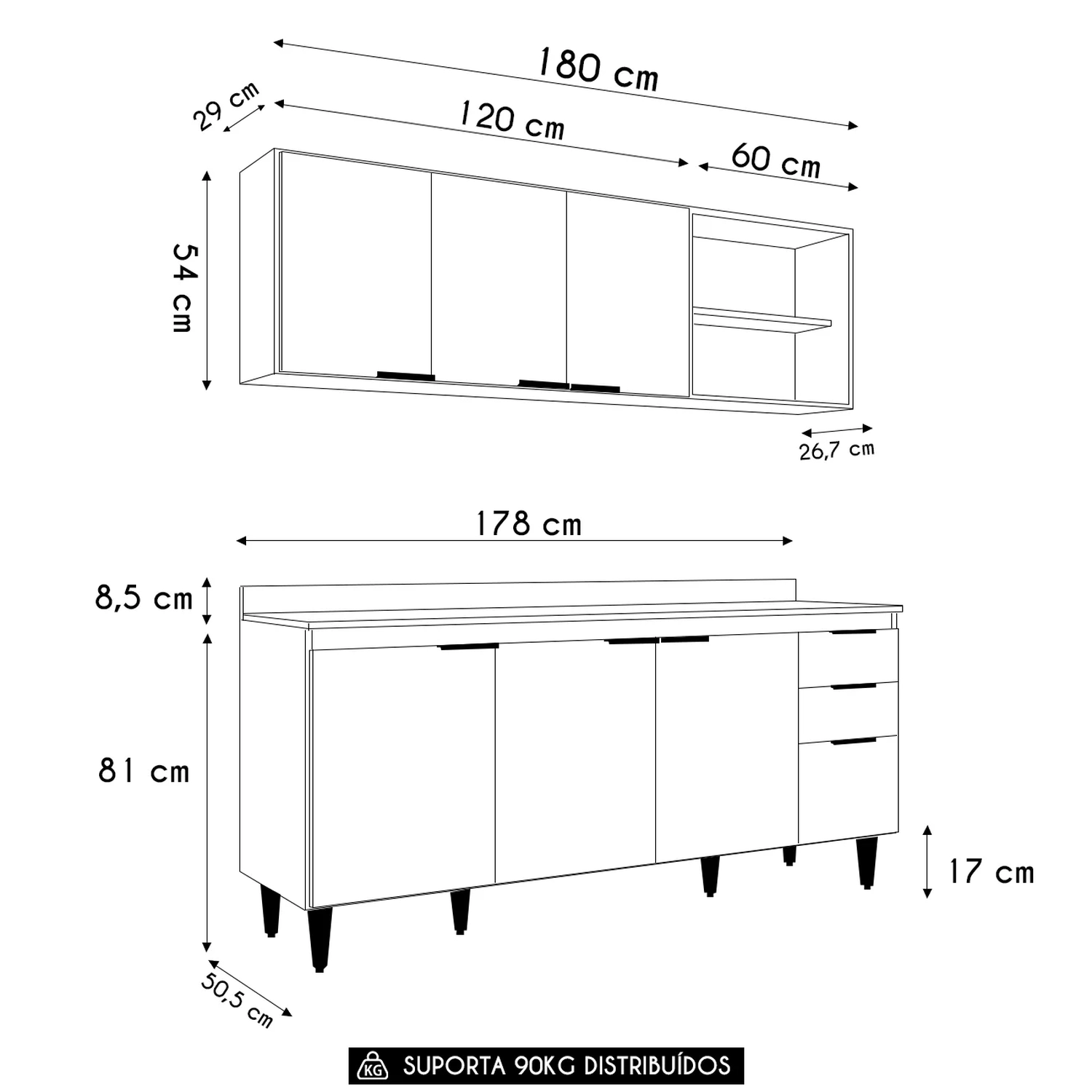 Conteúdo da Embalagem: 1 Armário Aéreo 120cm, 1 Armário Aéreo 60cm, 1 Balcão, 1 Tampo.