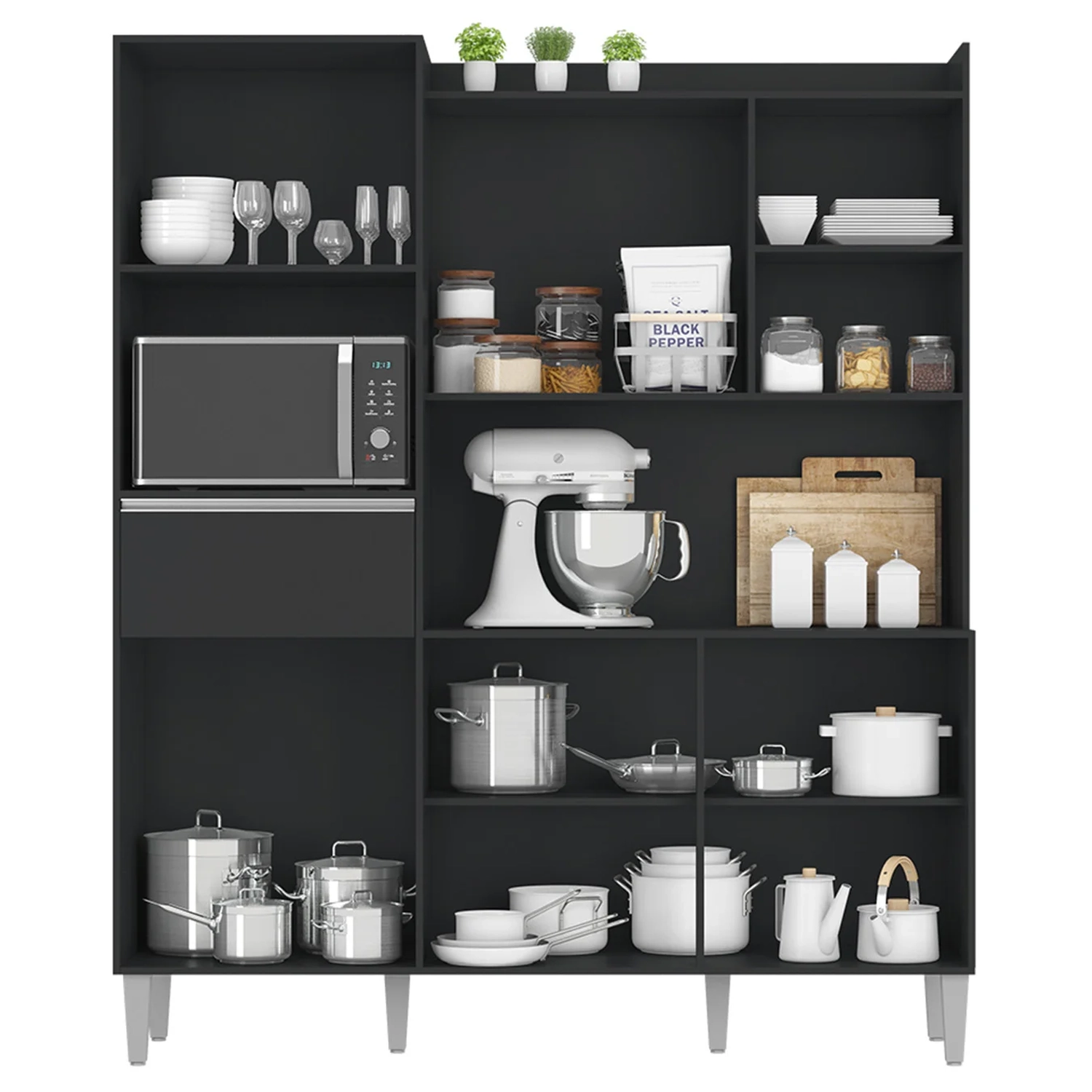 Além disso, o Armário dispõe de uma gaveta com corrediças metálicas, que deslizam com facilidade. Para complementar a organização, há quatro nichos amplos que podem ser usados para acomodar eletroportáteis, itens decorativos ou utensílios de uso frequente. O espaço superior também pode ser aproveitado, tornando o móvel ainda mais funcional.