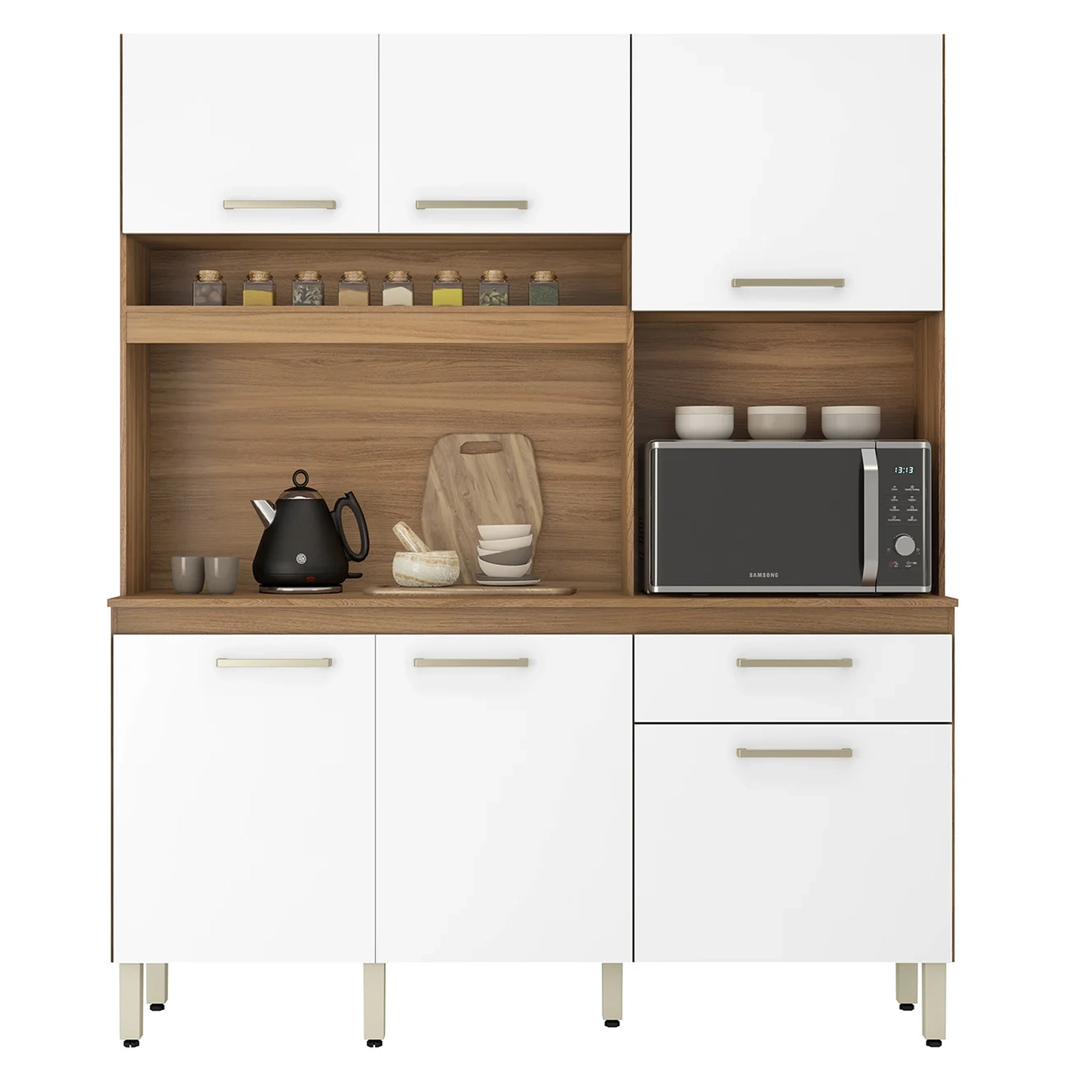 Com espaços otimizados, o Armário de Cozinha facilita o armazenamento de panelas, utensílios e eletroportáteis, além de contar com um nicho dedicado para micro-ondas e uma bancada ampla, ideal para o preparo de alimentos. Sua gaveta acomoda talheres com eficiência, enquanto os compartimentos e prateleiras oferecem soluções práticas para louças e outros itens. Essa Cozinha Compacta é fabricada em MDP com acabamento em pintura UV, o Armário Multiuso garante durabilidade e resistência. O fundo em HDF reforça a estrutura, e as portas e gavetas, com dobradiças e corrediças metálicas, proporcionam fácil acesso. Os pés com regulagem de altura asseguram estabilidade e proteção contra umidade, tornando-o perfeito para quem exigem versatilidade e praticidade.