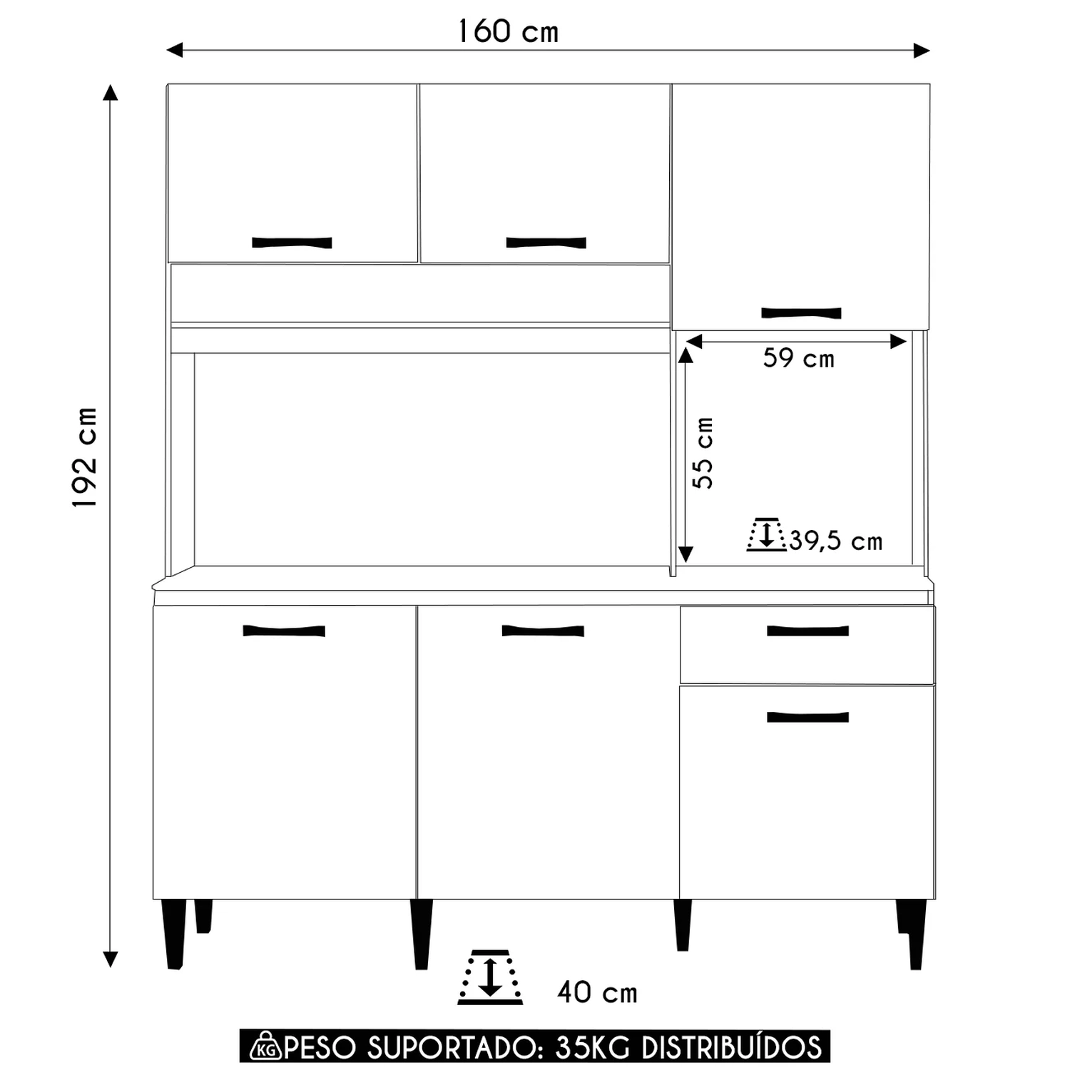 O Armário Para Cozinha tem um nicho perfeito para micro-ondas ou forno elétrico, deixando tudo organizado, ainda conta com uma superfície prática para melhor acesso.